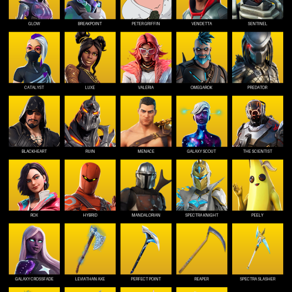 [PC/PSN/XBOX] | 89 skins | Reaper Axe | John Wick | Rogue Agent | Fade | Peter Griffin | Hybrid | Fusion | Midas | Blaze | Carbide | #WYH2367