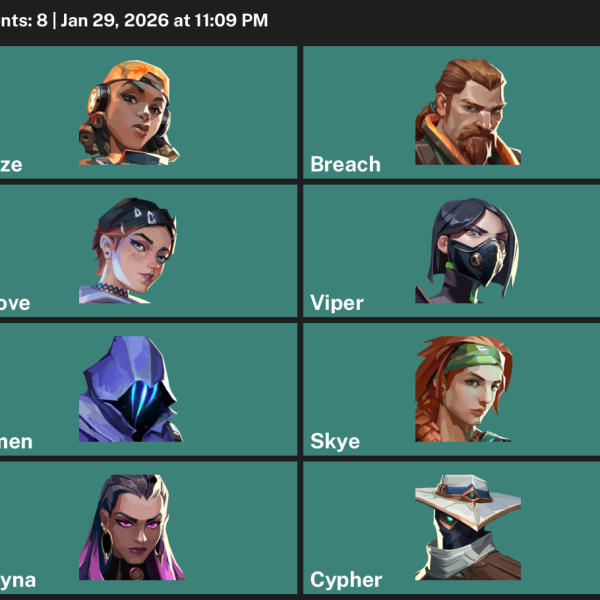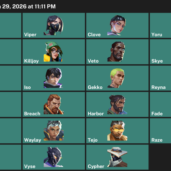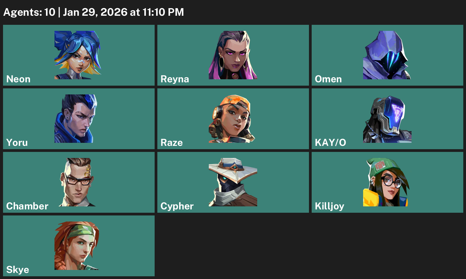 Neon, Reyna, Omen, Yoru, Raze, KAY/O, Chamber, Cypher, Killjoy, Skye