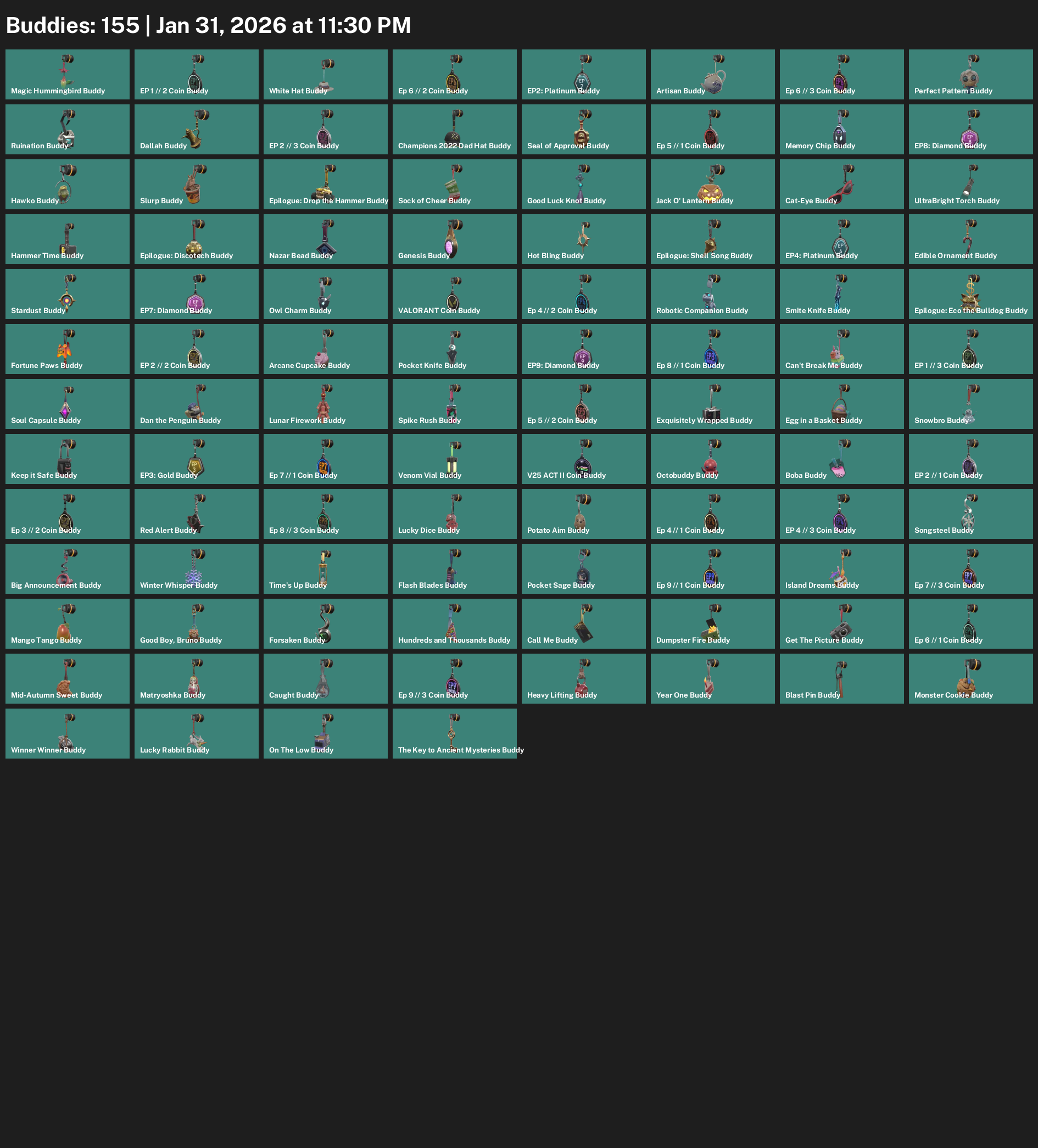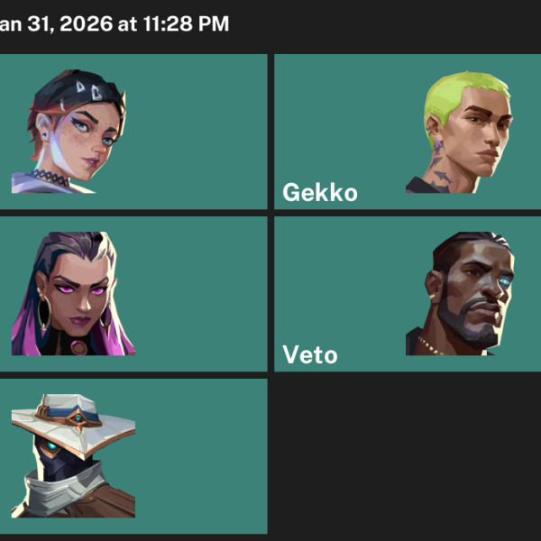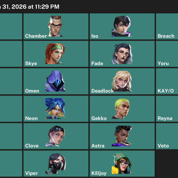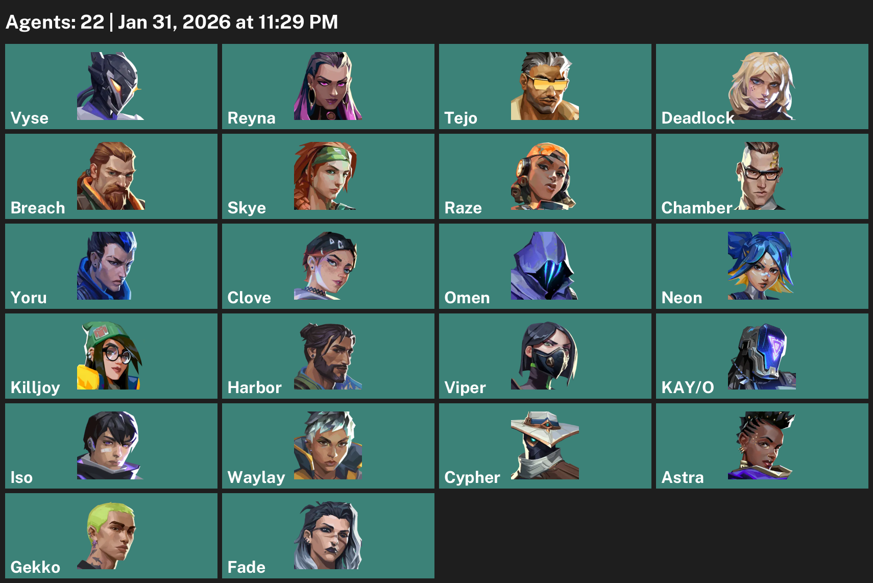 Vyse, Reyna, Tejo, Deadlock, Breach, Skye, Raze, Chamber, Yoru, Clove, Omen, Neon, Killjoy, Harbor, Viper, KAY/O, Iso, Waylay, Cypher, Astra, Gekko, Fade