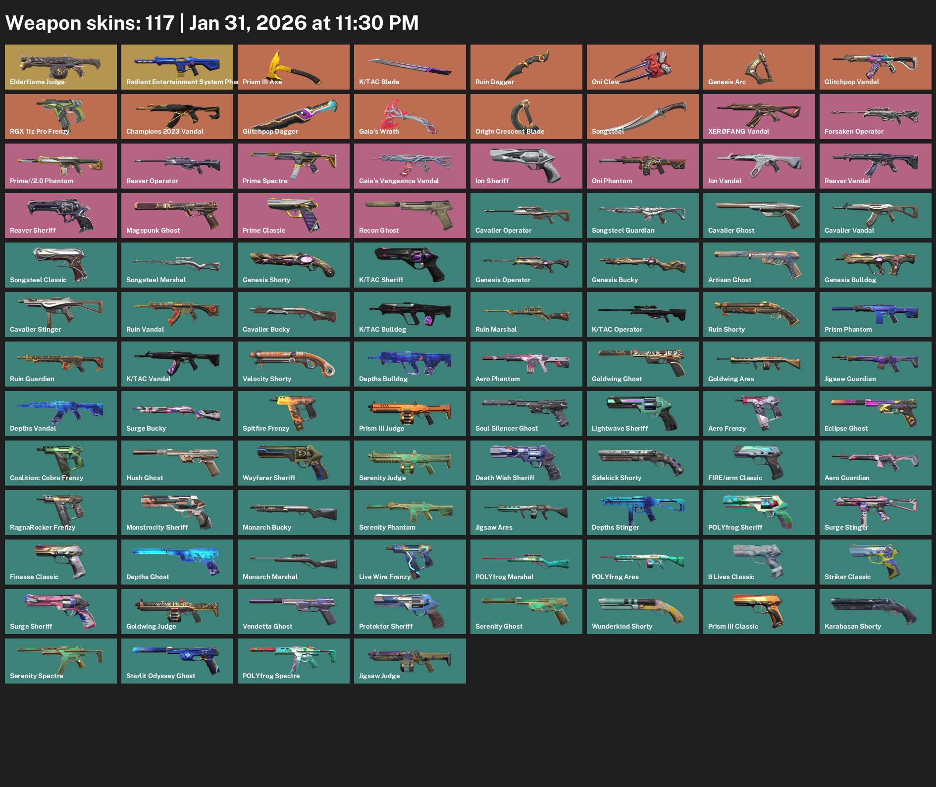 Elderflame Judge, Radiant Entertainment System Phantom, Prism III Axe, K/TAC Blade, Ruin Dagger, Oni Claw, Genesis Arc, Glitchpop Vandal, RGX 11z Pro Frenzy, Gaia’s Wrath, Songsteel, Forsaken Operator, Prime Spectre, Ion Sheriff