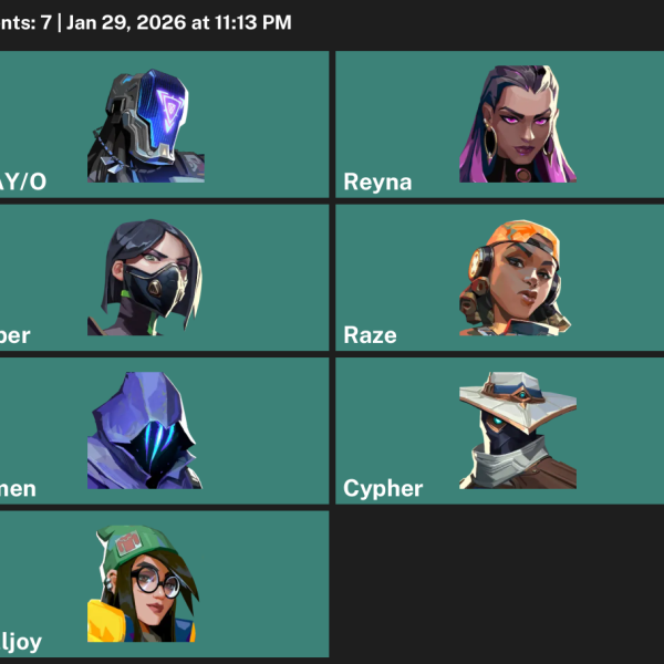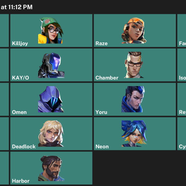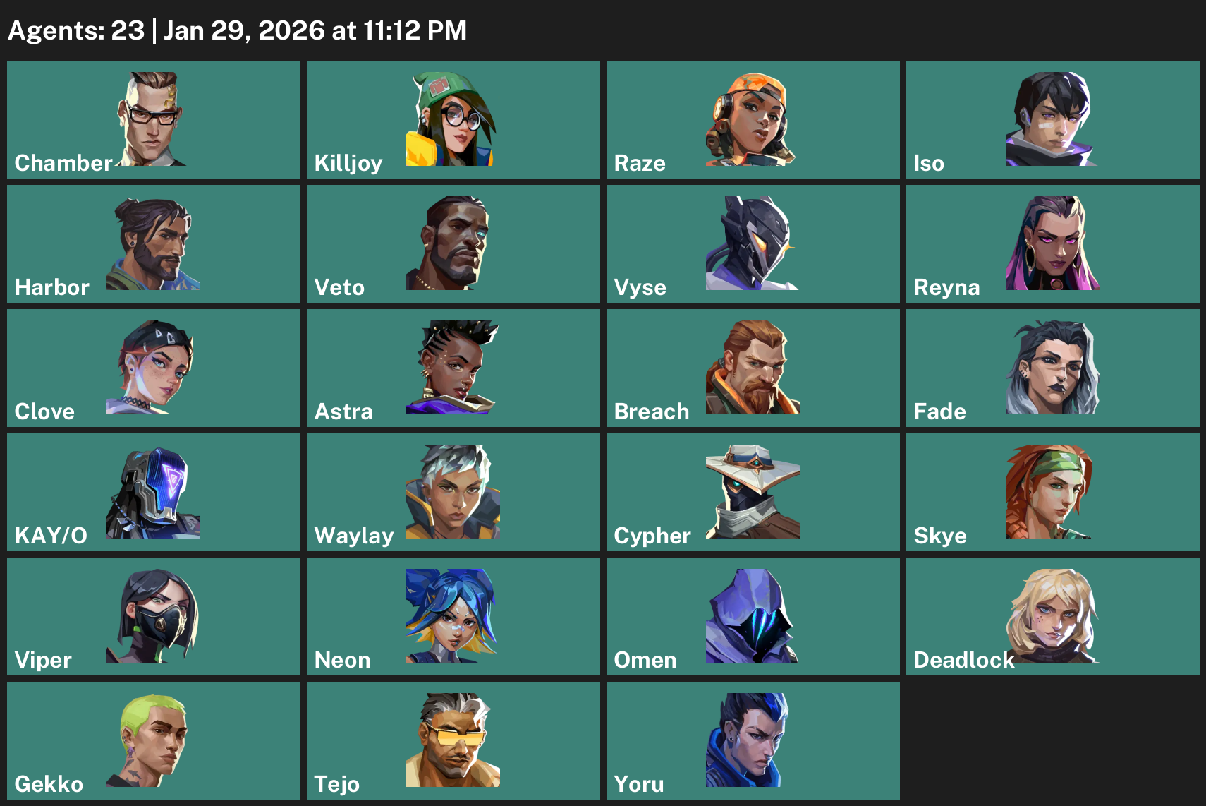 Chamber, Killjoy, Raze, Iso, Harbor, Vyse, Reyna, Clove, Astra, Breach, Fade, KAY/O, Waylay, Cypher, Skye, Viper, Neon, Omen, Deadlock, Gekko, Tejo, Yoru