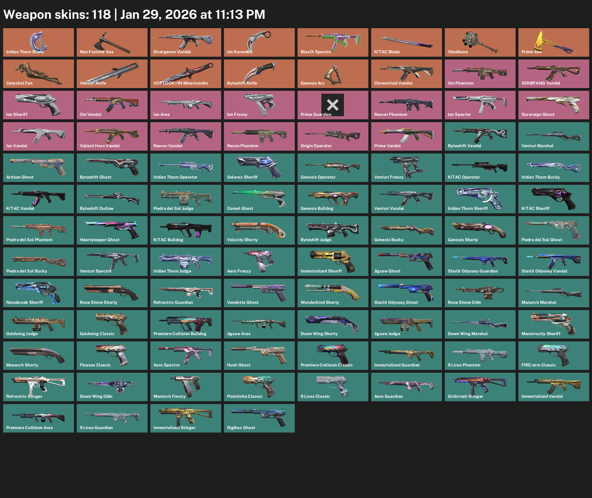 Iridian Thorn Blade, Neo Frontier Axe, Divergence Vandal, Ion Karambit, BlastX Spectre, Obsidiana, Celestial Fan, Venturi Knife, VCT LOCK//IN Misericórdia, Genesis Arc, Oni Phantom, Prime Guardian, Sovereign Ghost