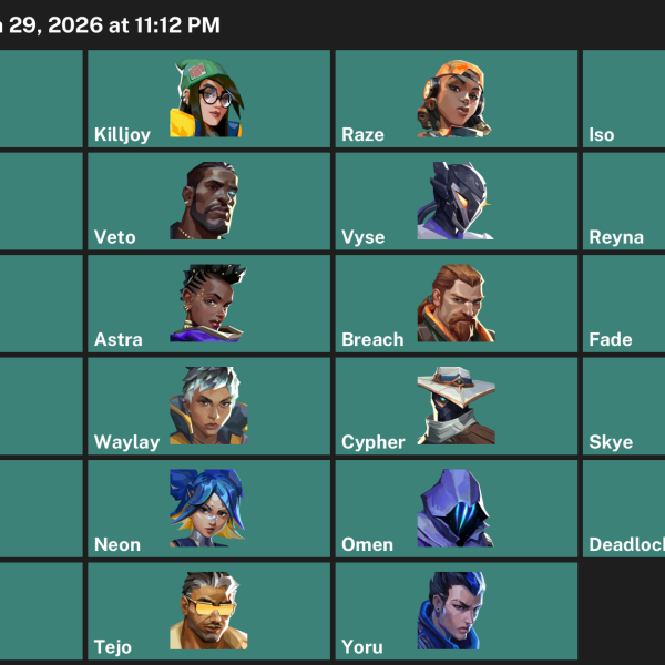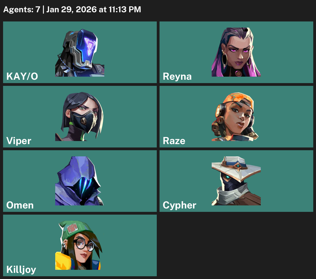 KAY/O, Reyna, Viper, Raze, Omen, Cypher, Killjoy