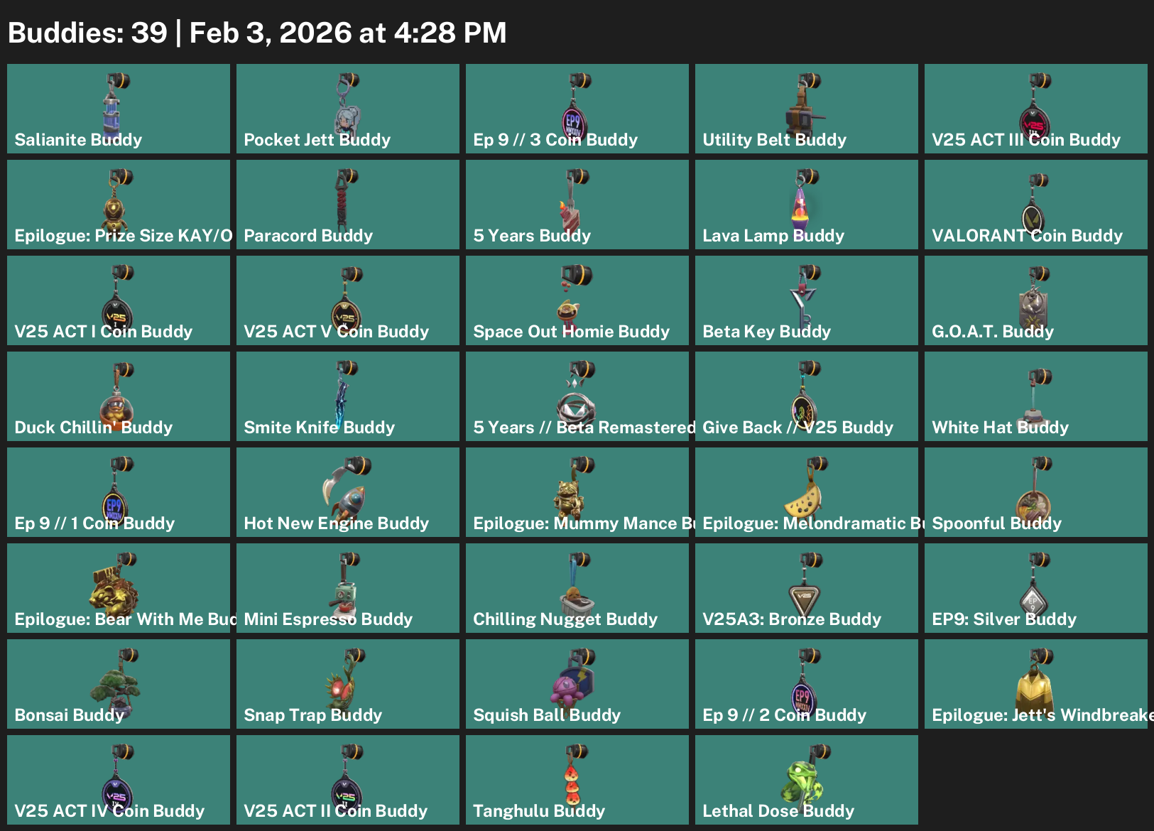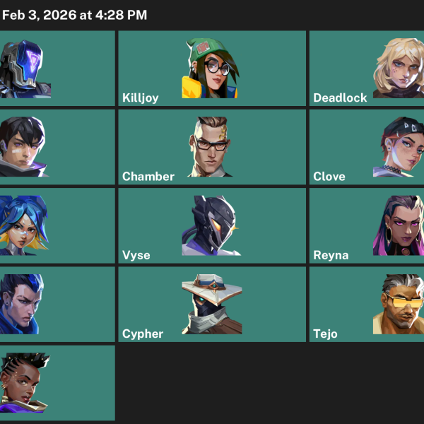Chamber, Cypher, Raze, Skye, Breach, Clove, Yoru, Tejo, Gekko, Killjoy, Reyna, Waylay, Vyse, Iso, KAY/O, Deadlock, Harbor, Viper, Omen, Neon, Astra, Fade