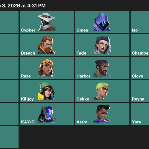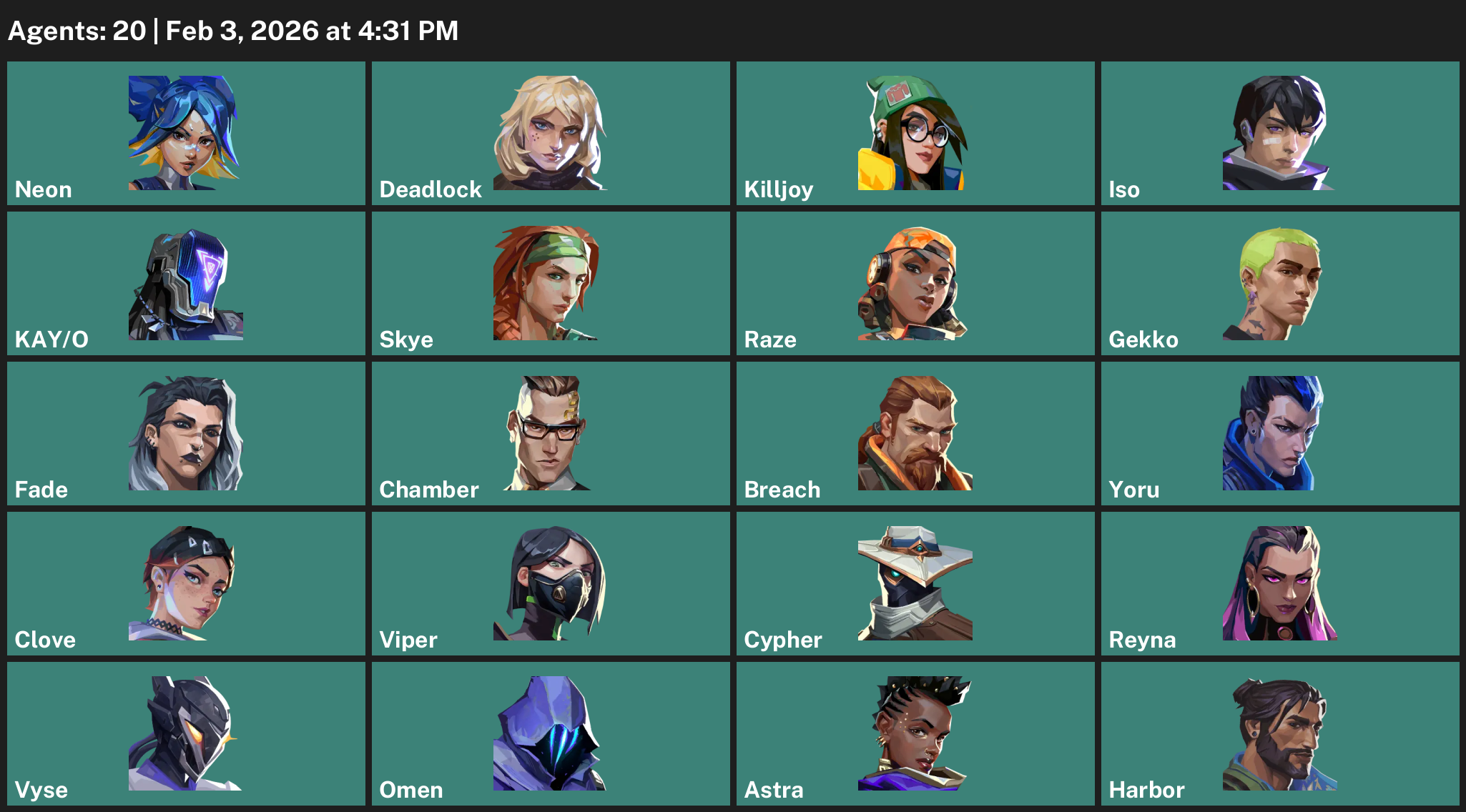 Neon, Deadlock, Killjoy, Iso, KAY/O, Skye, Raze, Gekko, Fade, Chamber, Breach, Yoru, Clove, Viper, Cypher, Reyna, Vyse, Omen, Astra, Harbor
