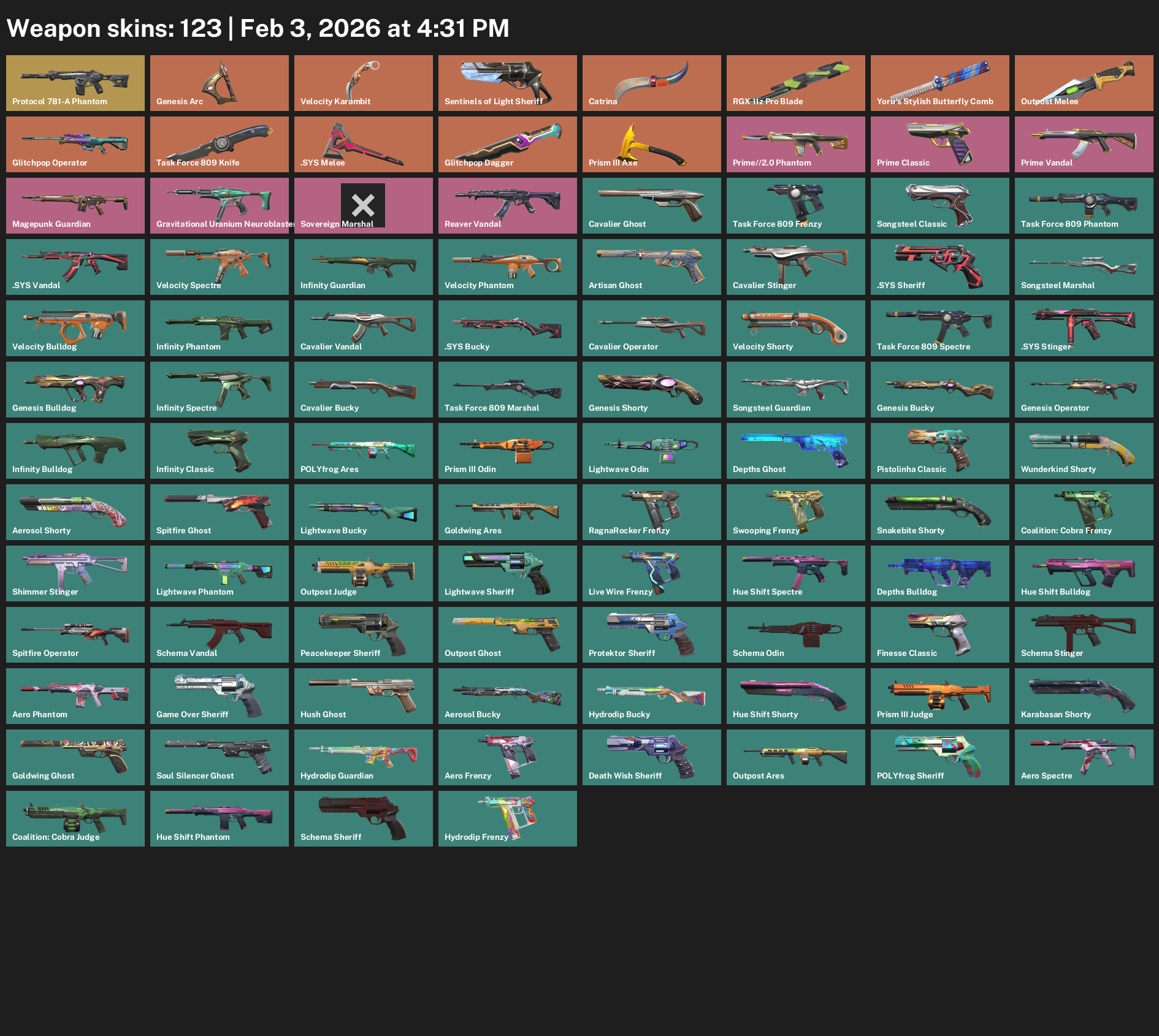 Protocol 781-A Phantom, Genesis Arc, Velocity Karambit, Sentinels of Light Sheriff, Catrina, RGX 11z Pro Blade, Yoru’s Stylish Butterfly Comb, Outpost Melee, Glitchpop Operator, Task Force 809 Knife, Prism III Axe, Prime Classic, Magepunk Guardian, Gravitational Uranium Neuroblaster Spectre, Sovereign Marshal, Reaver Vandal, Cavalier Ghost