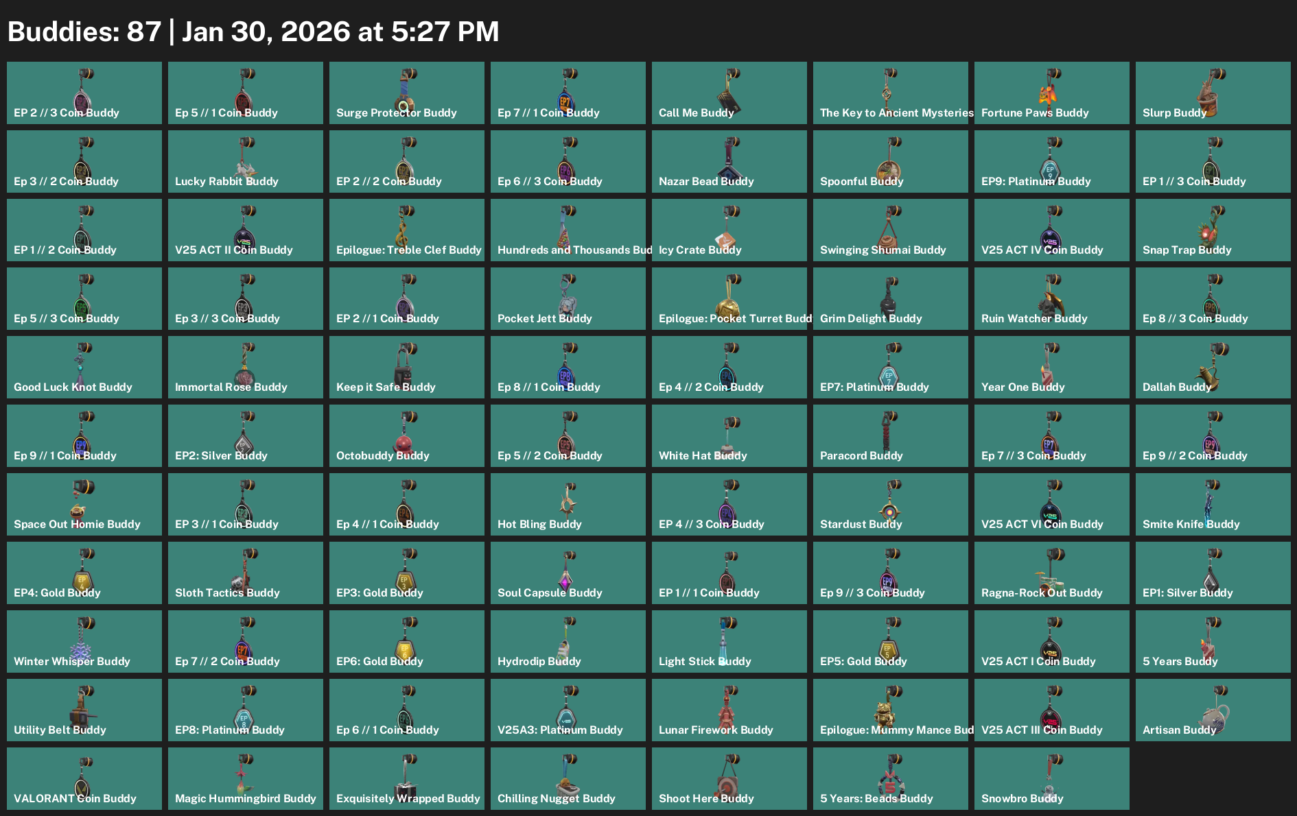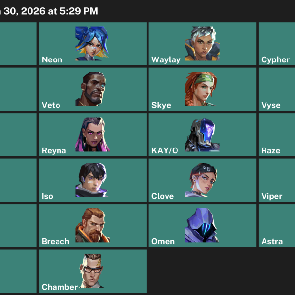 Reyna, Killjoy, Fade, Cypher, Iso, Yoru, Chamber, KAY/O, Gekko, Clove, Raze, Harbor, Neon, Skye, Deadlock, Tejo, Astra, Viper, Waylay, Vyse, Breach, Omen