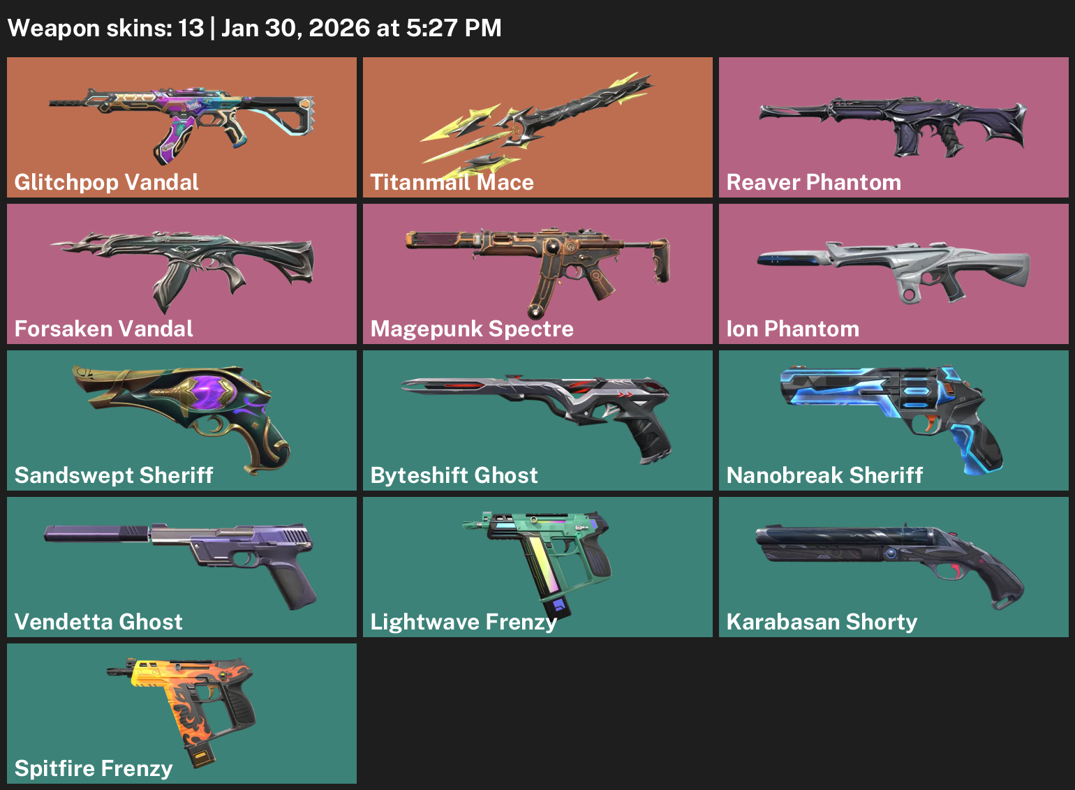 Glitchpop Vandal, Titanmail Mace, Reaver Phantom, Magepunk Spectre, Sandswept Sheriff, Byteshift Ghost, Lightwave Frenzy, Karabasan Shorty