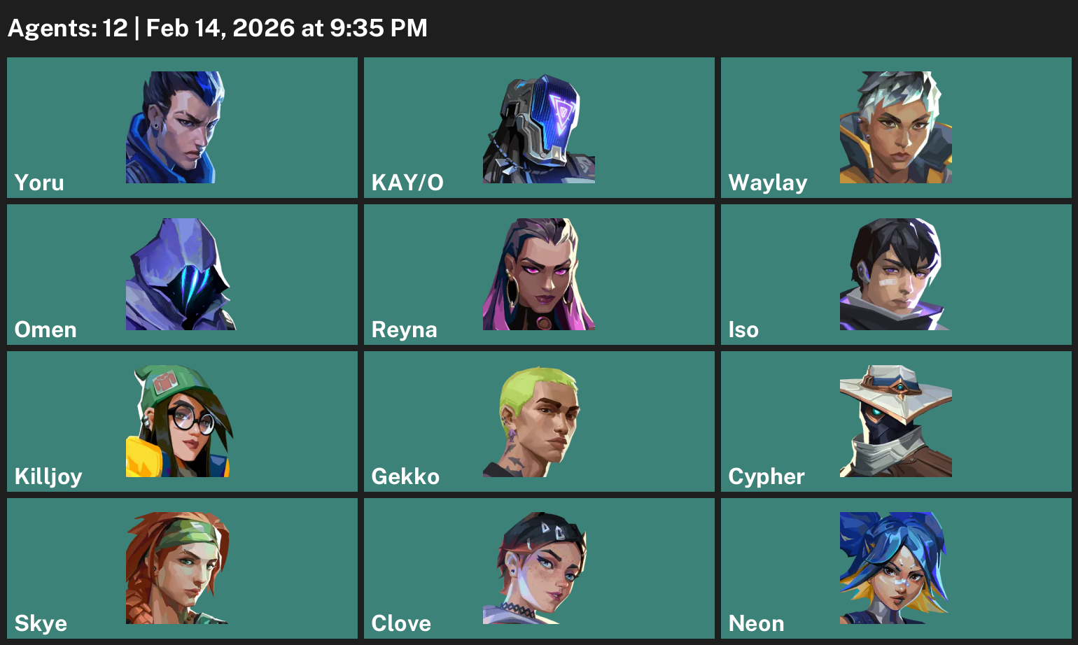 Yoru, KAY/O, Waylay, Omen, Reyna, Iso, Killjoy, Gekko, Cypher, Skye, Clove, Neon