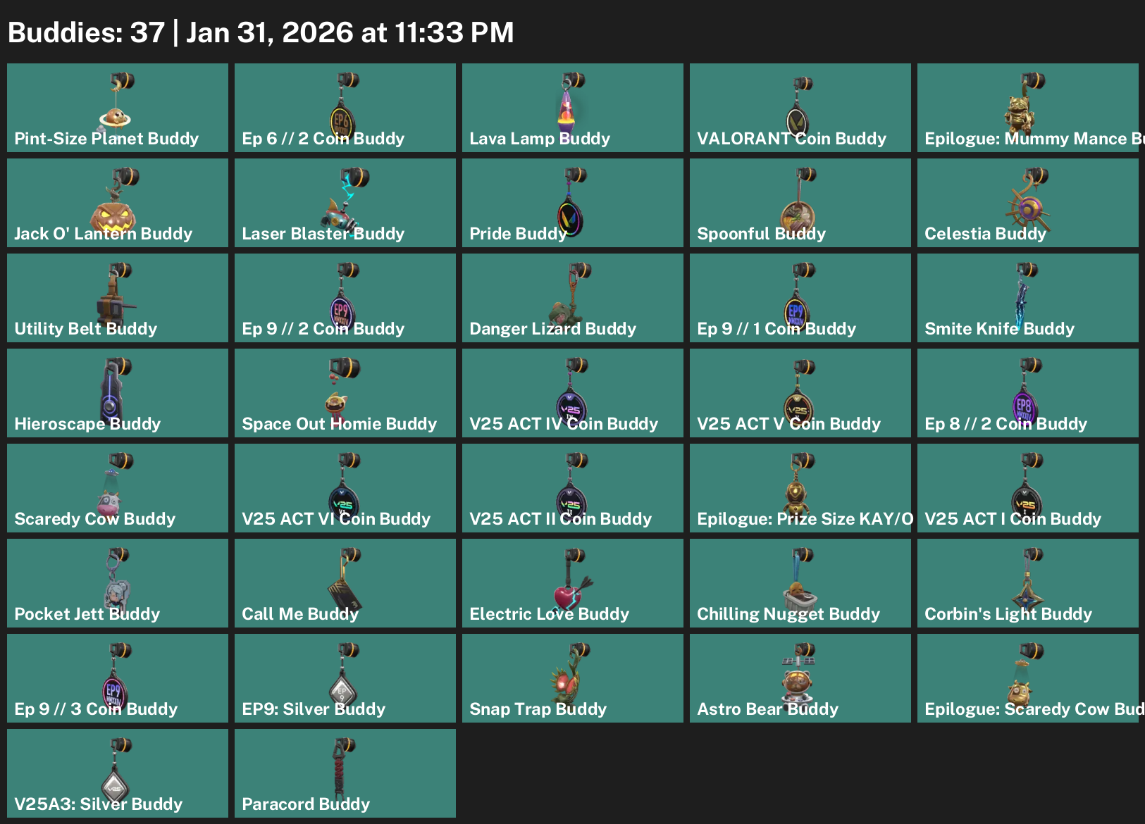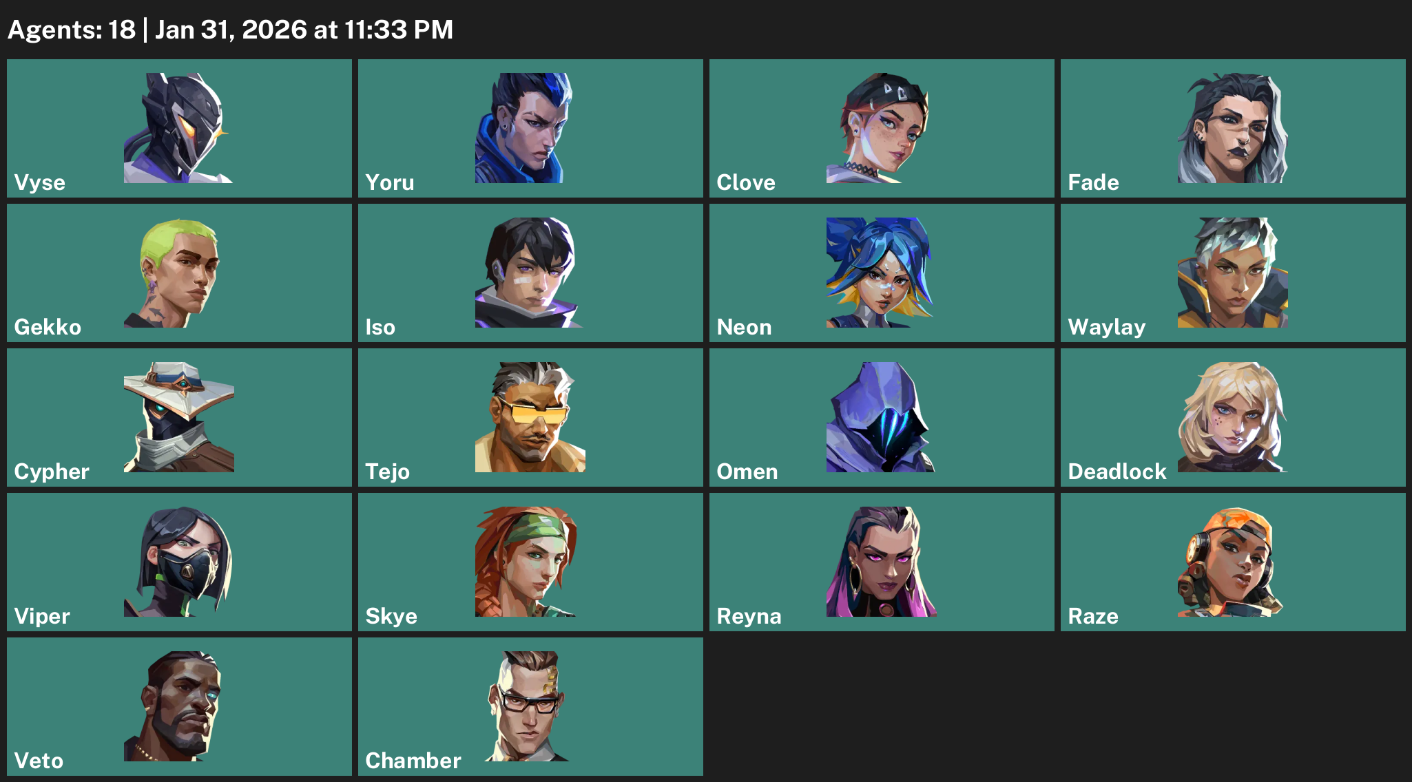 Vyse, Yoru, Clove, Fade, Gekko, Iso, Neon, Waylay, Cypher, Tejo, Omen, Deadlock, Viper, Skye, Reyna, Raze, Chamber