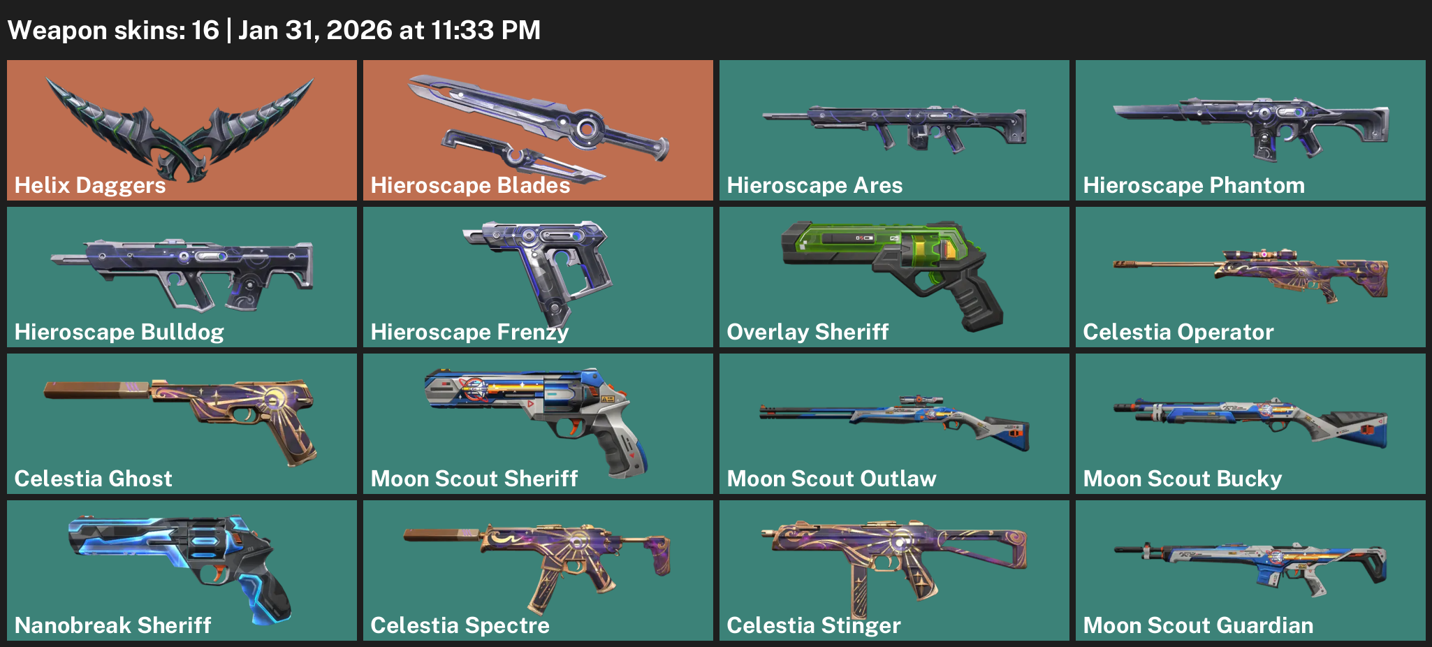 Helix Daggers, Hieroscape Blades, Overlay Sheriff, Celestia Operator, Moon Scout Outlaw