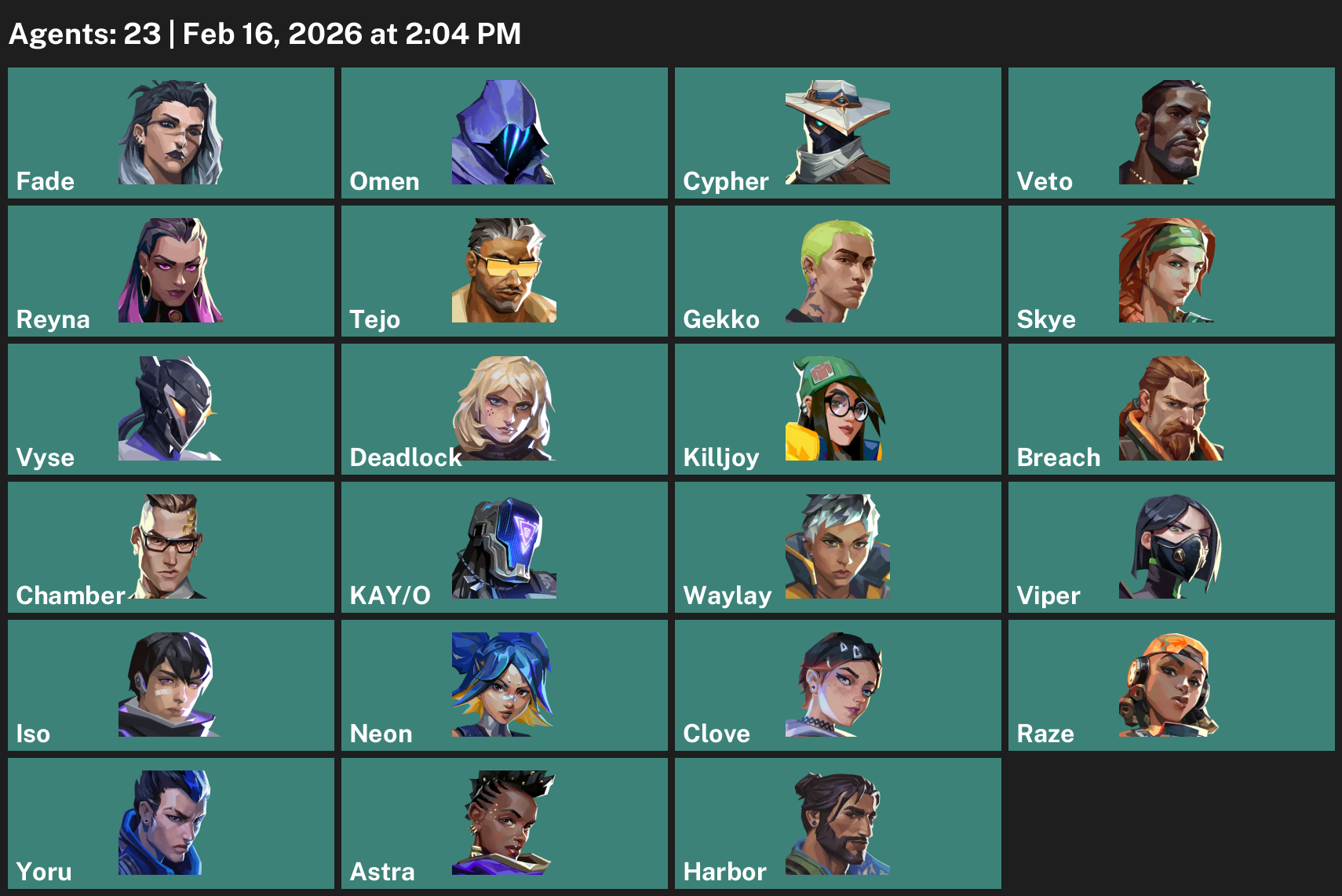 Fade, Omen, Cypher, Reyna, Tejo, Gekko, Skye, Vyse, Deadlock, Killjoy, Breach, Chamber, KAY/O, Waylay, Viper, Iso, Neon, Clove, Raze, Yoru, Astra, Harbor