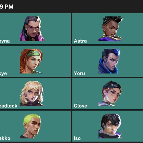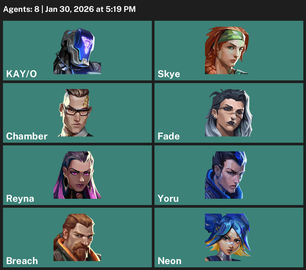 KAY/O, Skye, Chamber, Fade, Reyna, Yoru, Breach, Neon