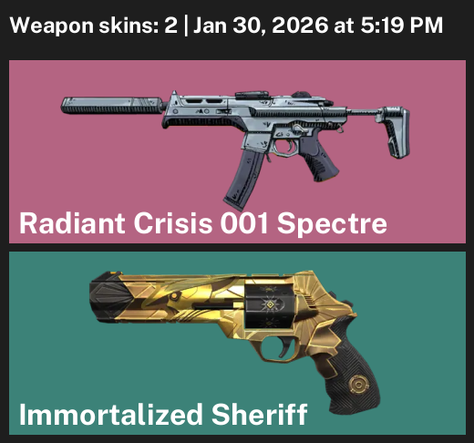 HomeValorant AP | 2 Skins | exp GOLD 2 | Radiant Crisis 001 Spectre | Immortalized Sheriff | #SNF9923