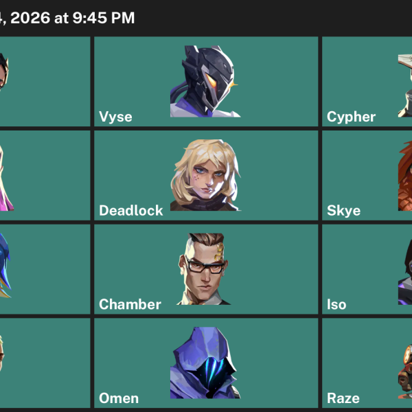 Skye, Viper, Iso, KAY/O, Reyna, Gekko, Chamber, Tejo, Neon, Harbor, Raze, Fade, Astra, Killjoy, Breach, Omen, Cypher, Yoru