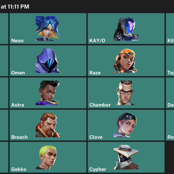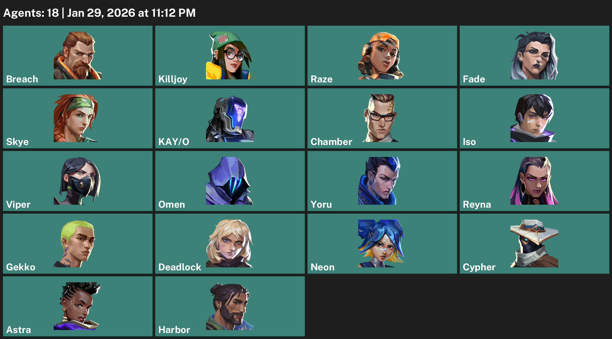Breach, Killjoy, Raze, Fade, Skye, KAY/O, Chamber, Iso, Viper, Omen, Yoru, Reyna, Gekko, Deadlock, Neon, Cypher, Astra, Harbor