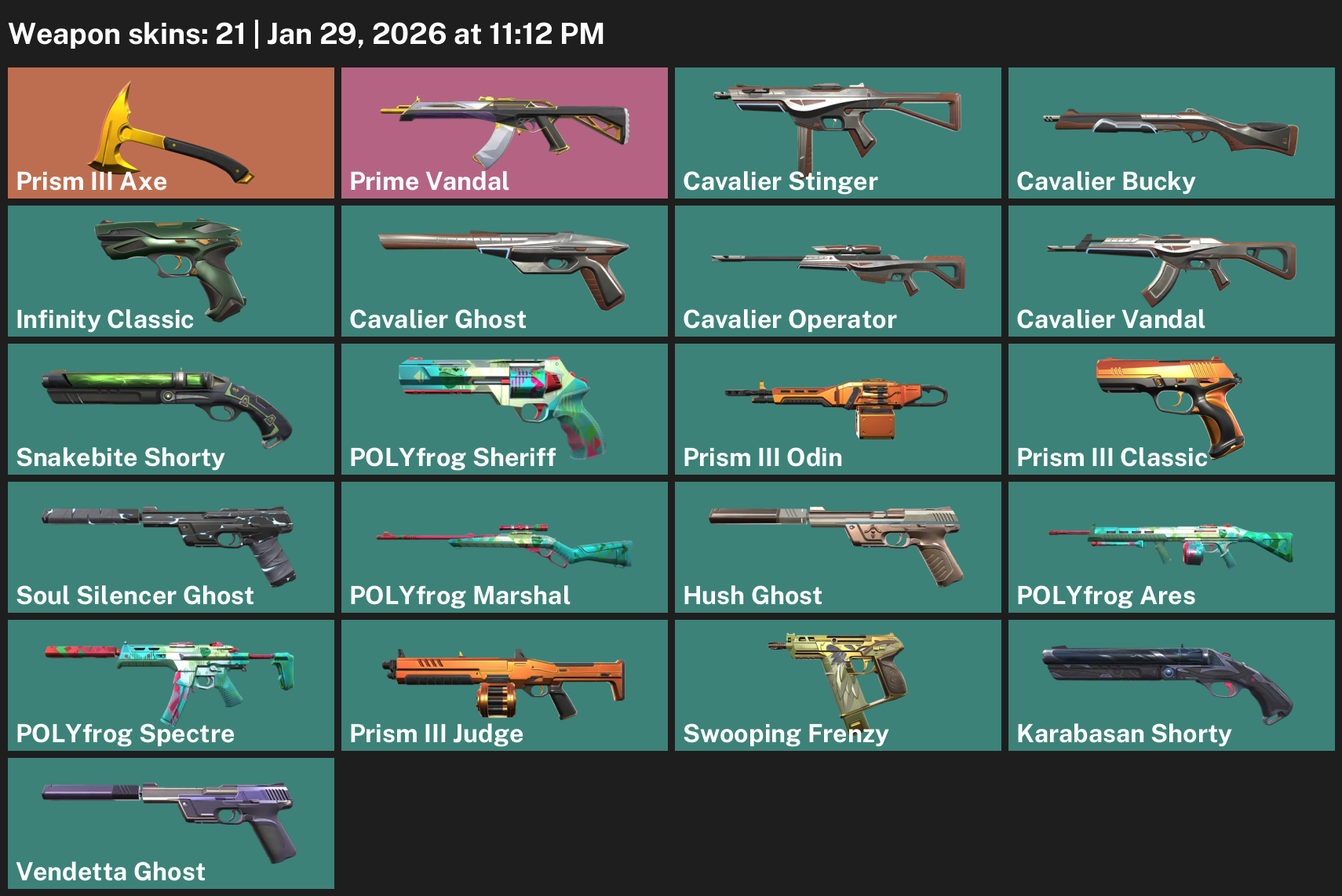 Prism III Axe, Prime Vandal, Cavalier Stinger, Infinity Classic, Snakebite Shorty, POLYfrog Sheriff, Soul Silencer Ghost, Swooping Frenzy