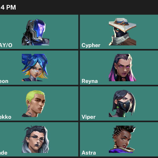 Gekko, Tejo, Reyna, Deadlock, Vyse, Omen, Yoru, Clove, Cypher, KAY/O, Waylay, Harbor, Killjoy, Chamber, Breach, Neon, Fade, Iso, Raze, Viper, Skye, Astra