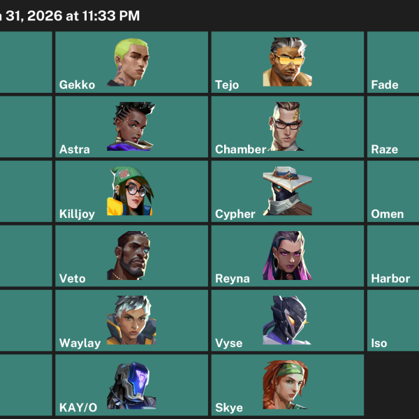 Deadlock, Cypher, Clove, Reyna, Gekko, Breach, Skye, Tejo, Omen, Raze, Astra, Chamber, Fade, Harbor, Killjoy, Viper, Iso, KAY/O, Neon, Yoru, Vyse, Waylay