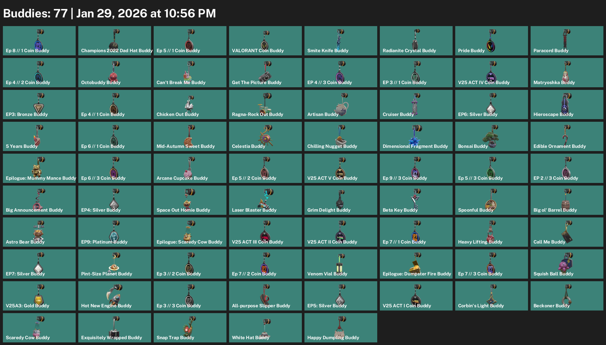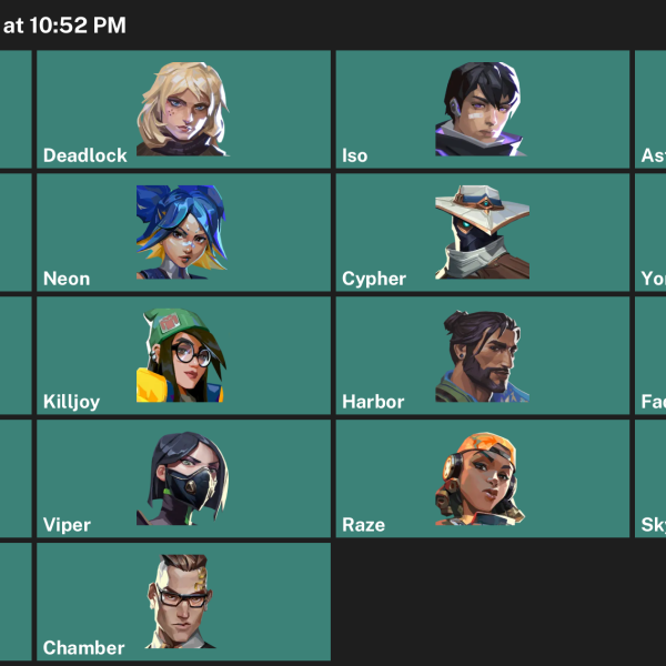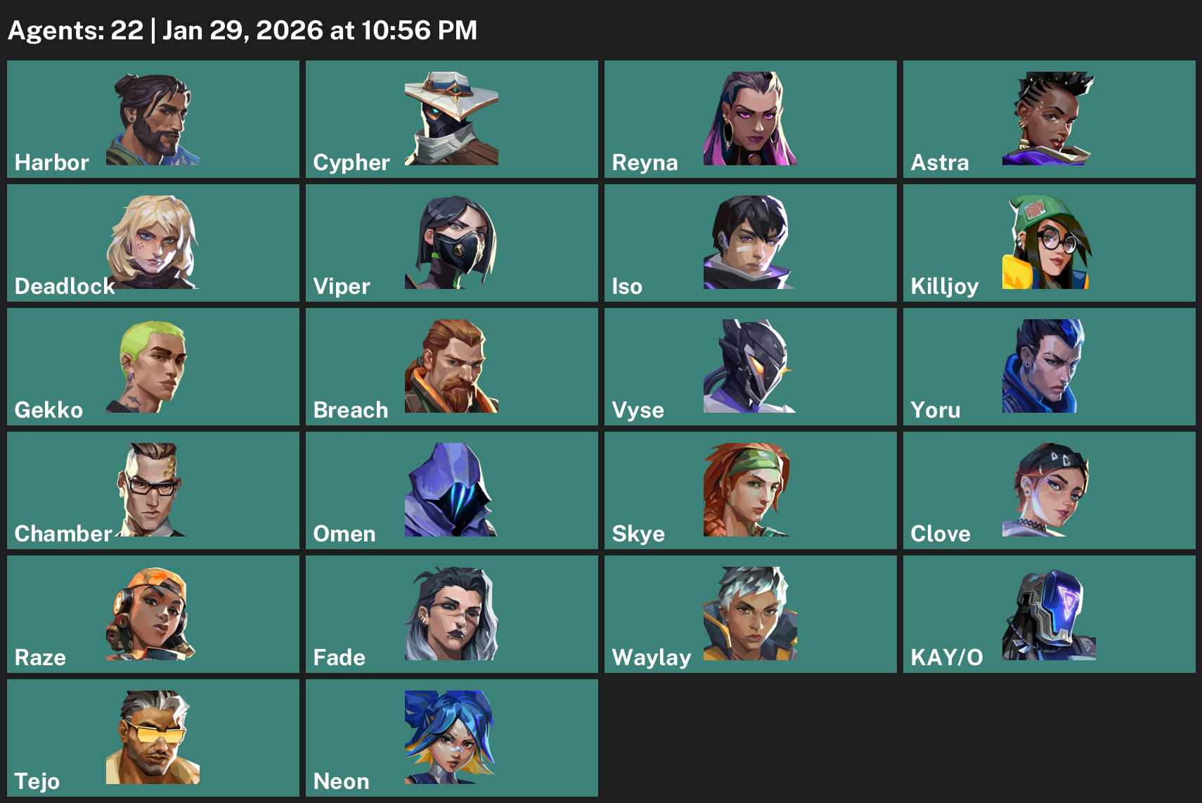 Harbor, Cypher, Reyna, Astra, Deadlock, Viper, Iso, Killjoy, Gekko, Breach, Vyse, Yoru, Chamber, Omen, Skye, Clove, Raze, Fade, Waylay, KAY/O, Tejo, Neon