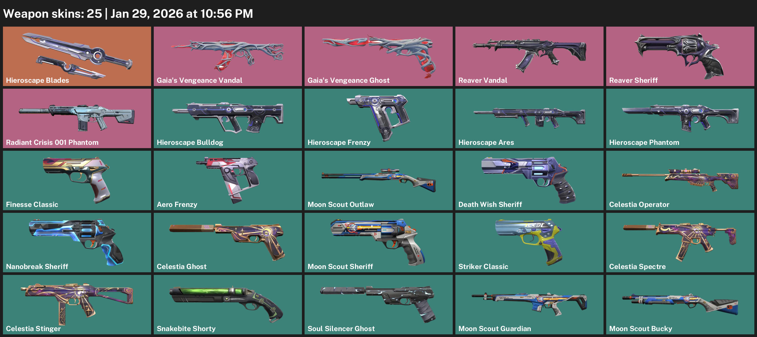 Hieroscape Blades, Gaia’s Vengeance Vandal, Reaver Sheriff, Radiant Crisis 001 Phantom, Finesse Classic, Aero Frenzy, Moon Scout Outlaw, Celestia Operator, Snakebite Shorty, Soul Silencer Ghost