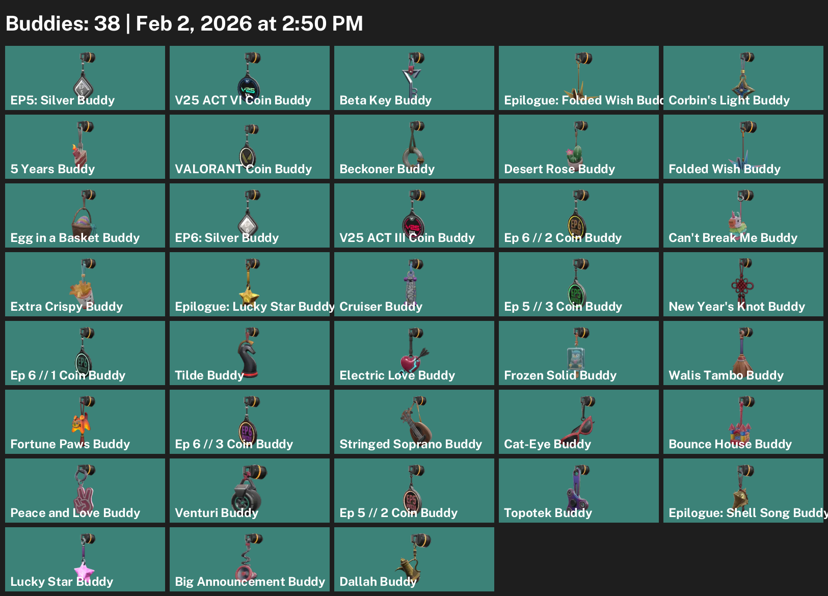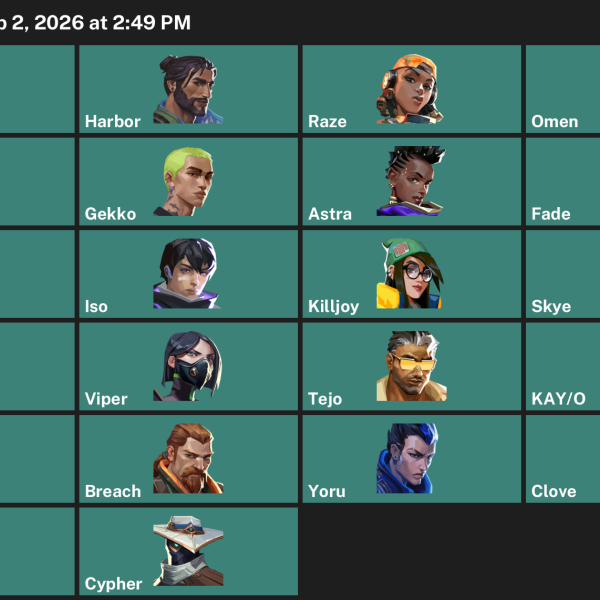 Gekko, KAY/O, Cypher, Skye, Astra, Omen, Viper, Reyna, Harbor, Deadlock, Chamber, Neon, Breach, Yoru, Vyse, Fade, Killjoy, Raze