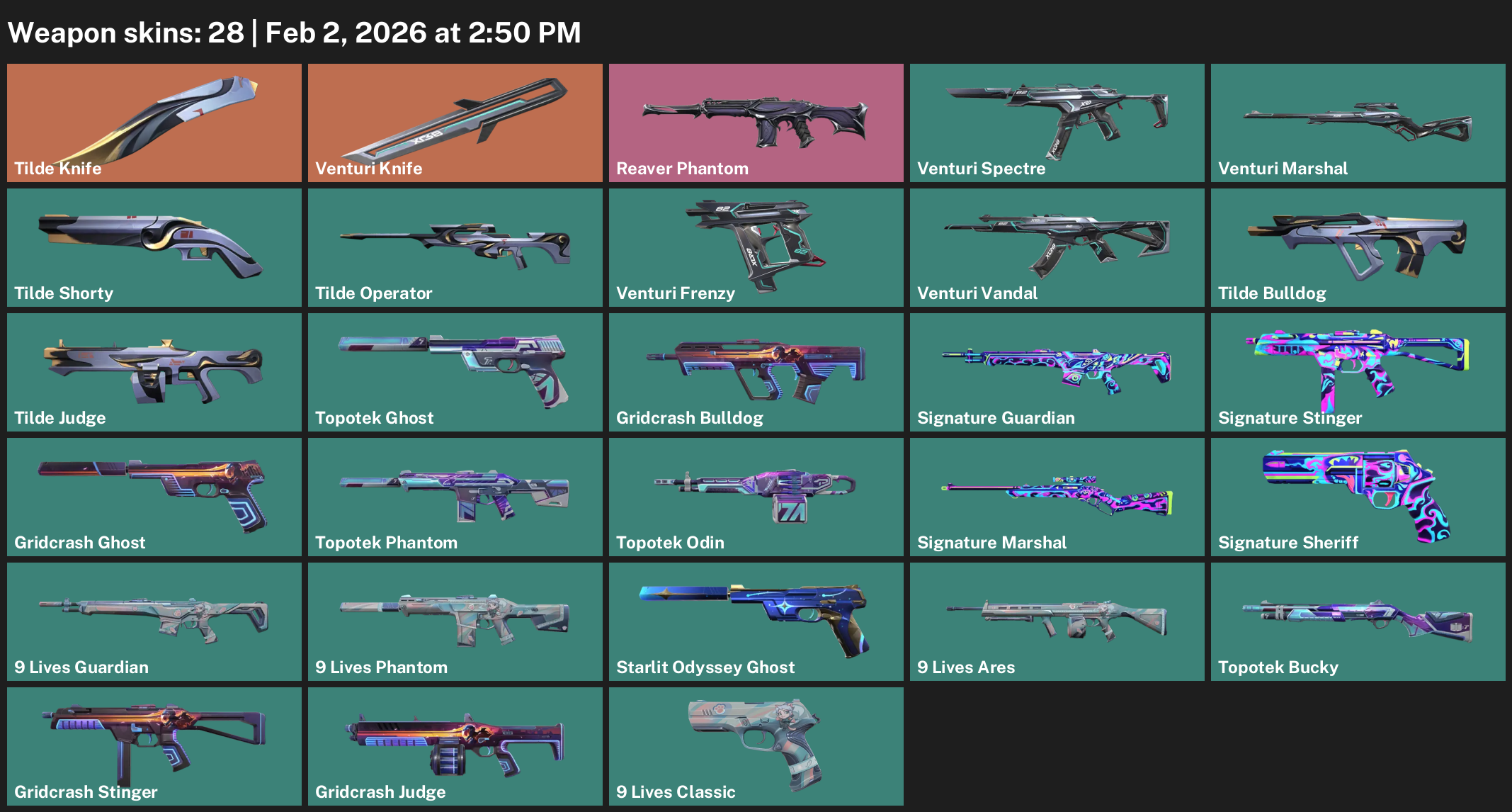 Tilde Knife, Reaver Phantom, Venturi Spectre, Topotek Ghost, Gridcrash Bulldog, Signature Guardian, 9 Lives Ares