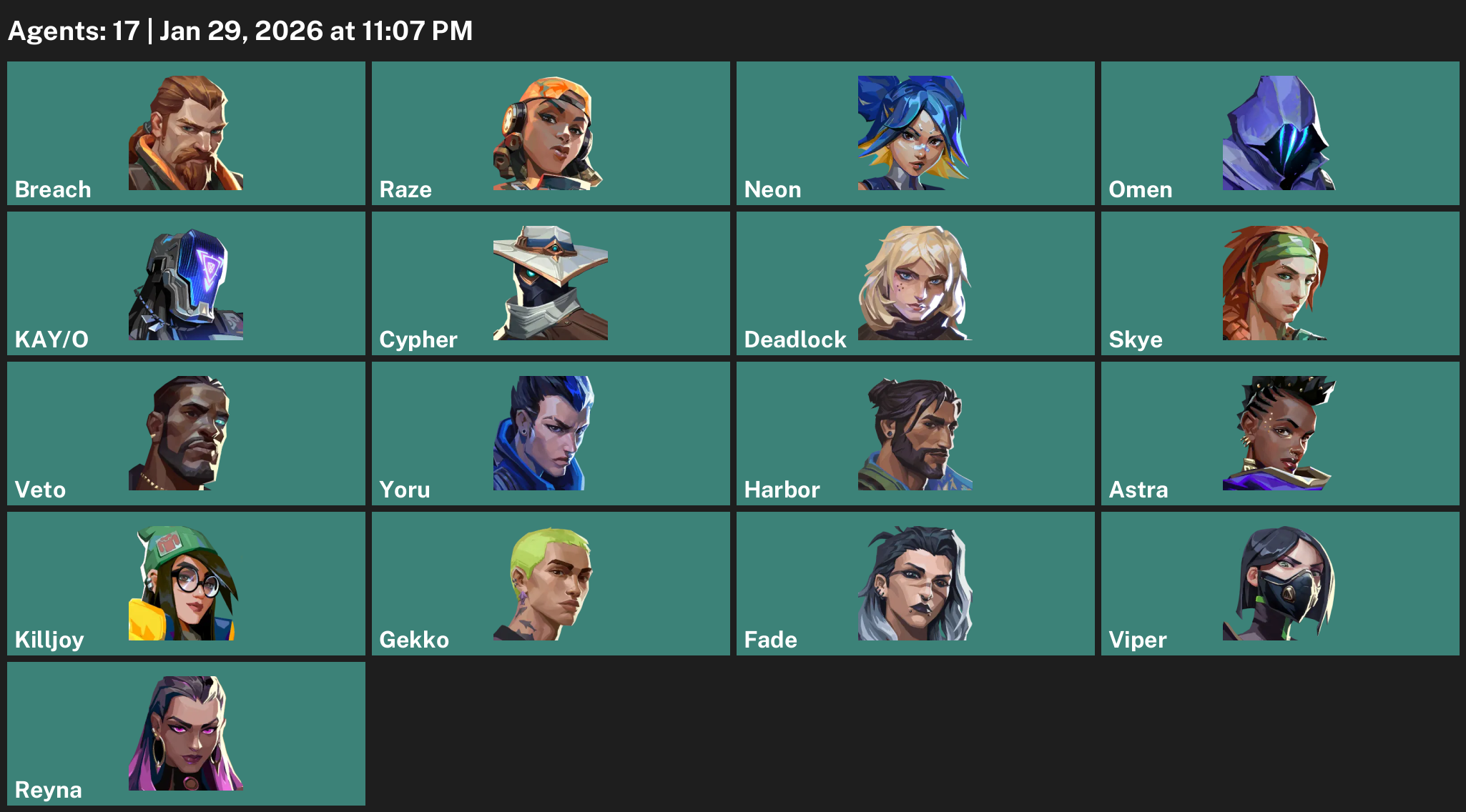 Breach, Raze, Neon, Omen, KAY/O, Cypher, Deadlock, Skye, Yoru, Harbor, Astra, Killjoy, Gekko, Fade, Viper, Reyna
