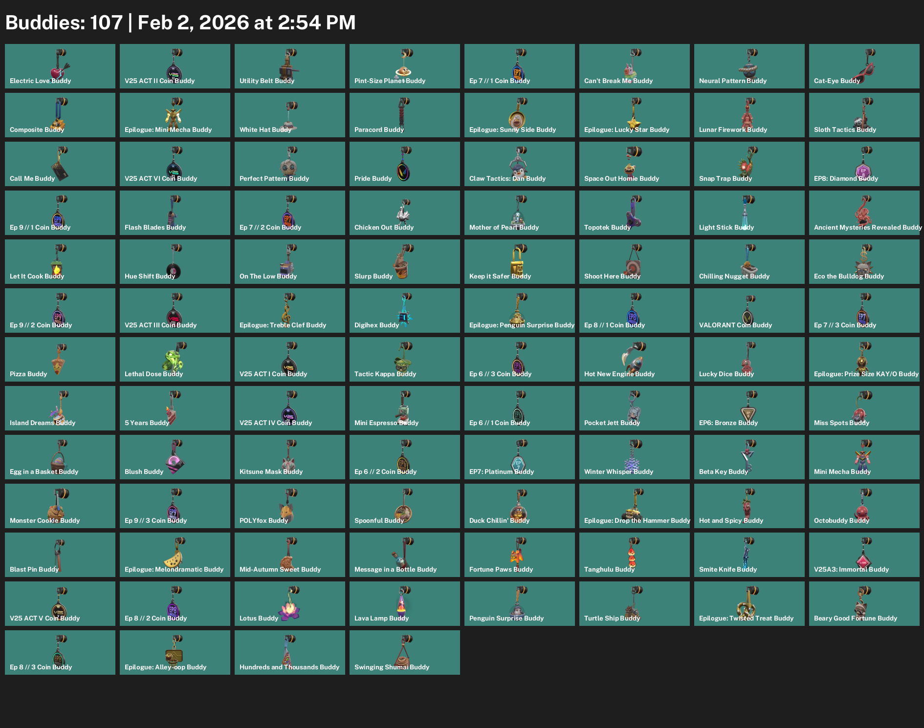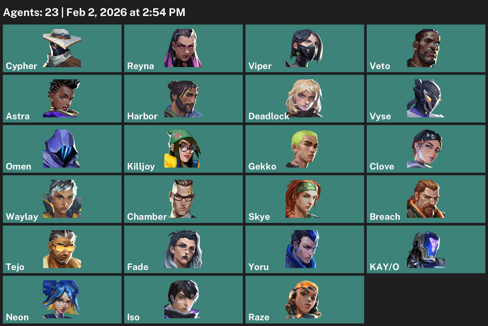 Cypher, Reyna, Viper, Astra, Harbor, Deadlock, Vyse, Omen, Killjoy, Gekko, Clove, Waylay, Chamber, Skye, Breach, Tejo, Fade, Yoru, KAY/O, Neon, Iso, Raze