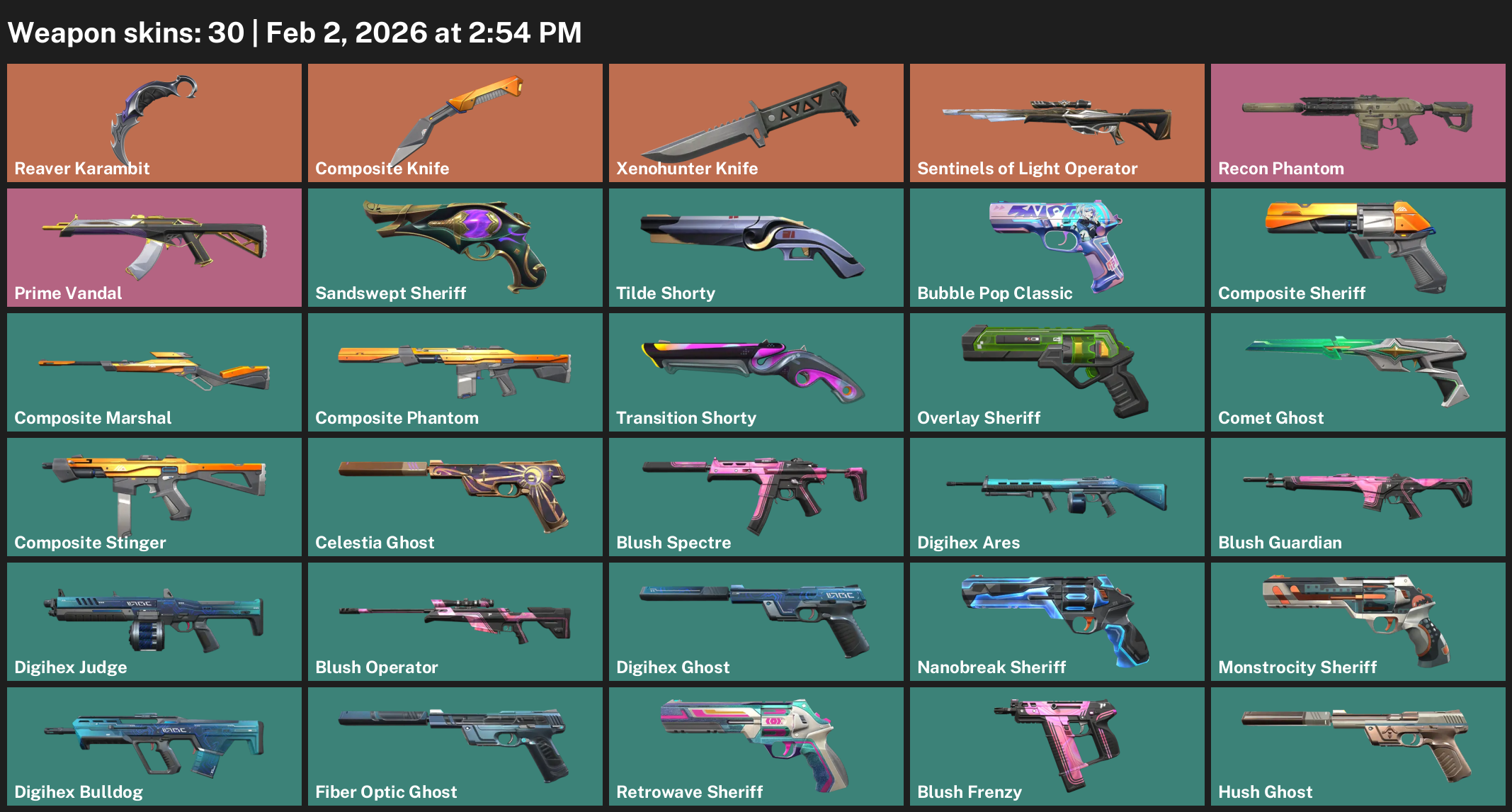 Reaver Karambit, Composite Knife, Sentinels of Light Operator, Recon Phantom, Prime Vandal, Sandswept Sheriff, Tilde Shorty, Bubble Pop Classic, Comet Ghost, Blush Spectre, Digihex Ares