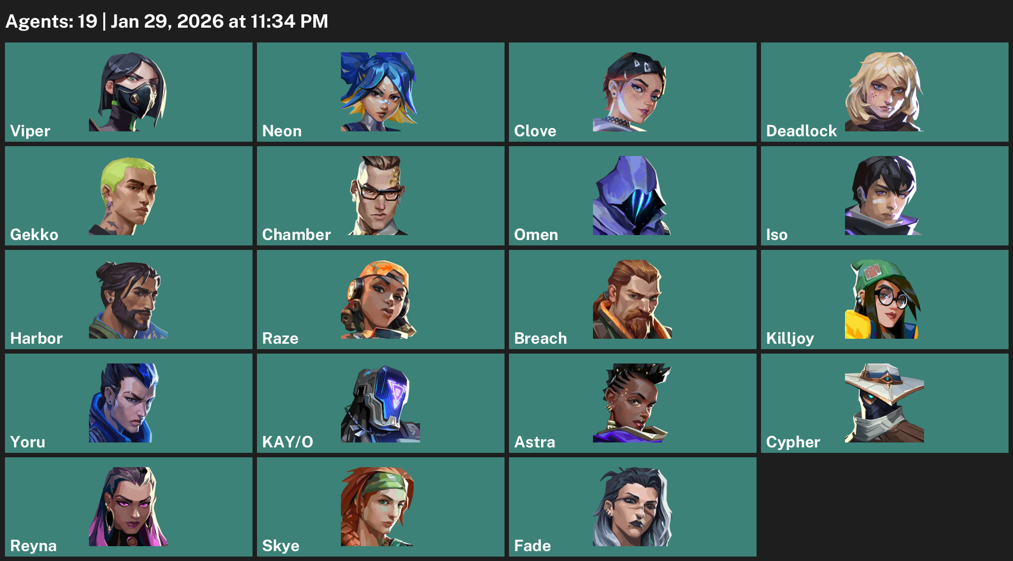 Viper, Neon, Clove, Deadlock, Gekko, Chamber, Omen, Iso, Harbor, Raze, Breach, Killjoy, Yoru, KAY/O, Astra, Cypher, Reyna, Skye, Fade