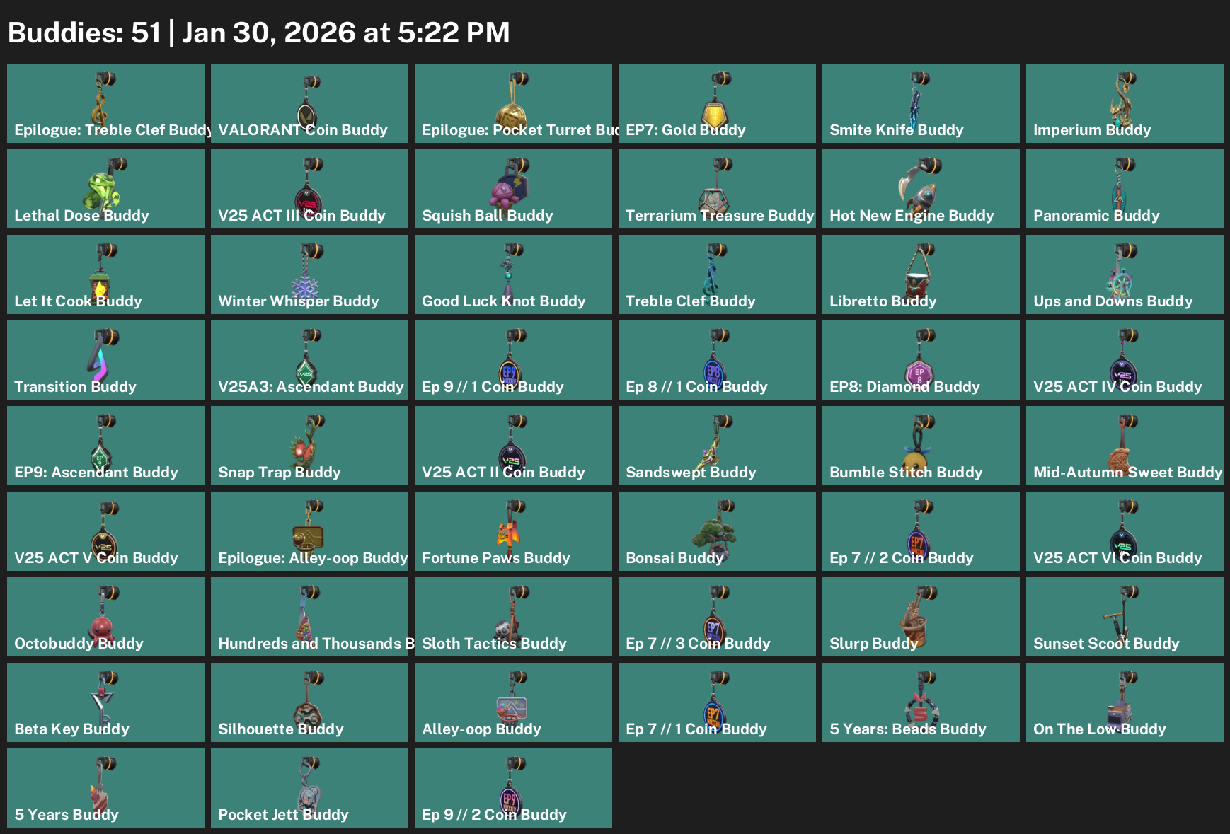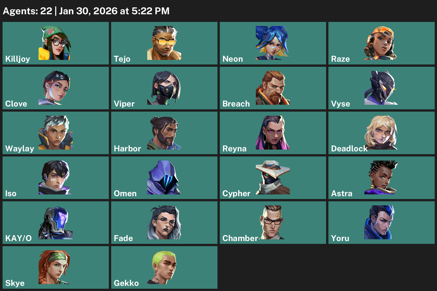 Killjoy, Tejo, Neon, Raze, Clove, Viper, Breach, Vyse, Waylay, Harbor, Reyna, Deadlock, Iso, Omen, Cypher, Astra, KAY/O, Fade, Chamber, Yoru, Skye, Gekko