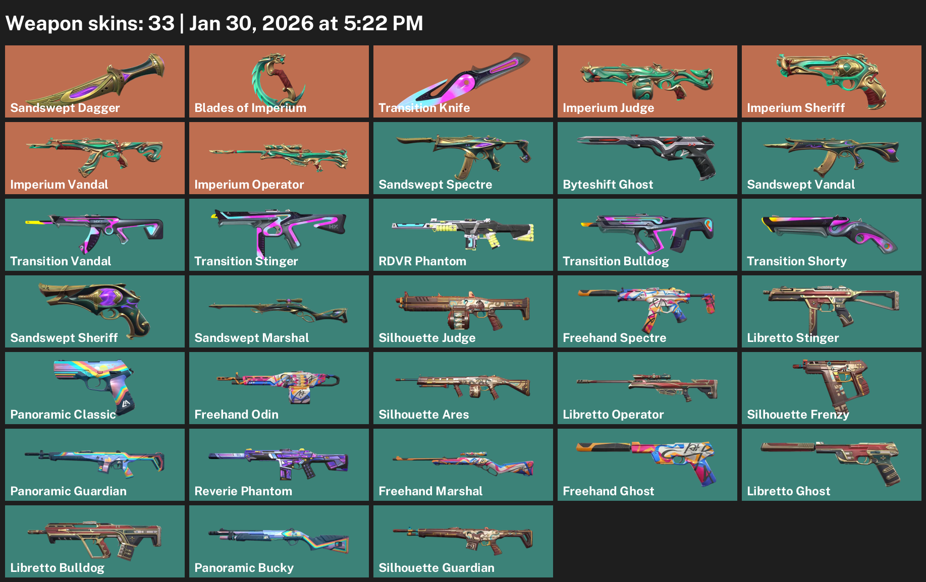 Sandswept Dagger, Blades of Imperium, Transition Knife, Byteshift Ghost, RDVR Phantom, Silhouette Judge, Freehand Spectre, Libretto Stinger, Panoramic Classic