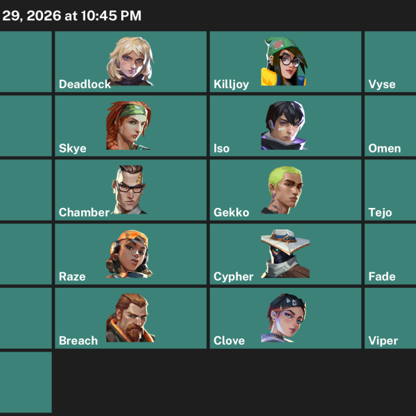 Chamber, Omen, Gekko, Skye, KAY/O, Killjoy, Raze, Yoru, Harbor, Astra, Neon, Iso, Deadlock, Breach, Cypher, Clove, Reyna, Tejo, Fade, Vyse, Viper