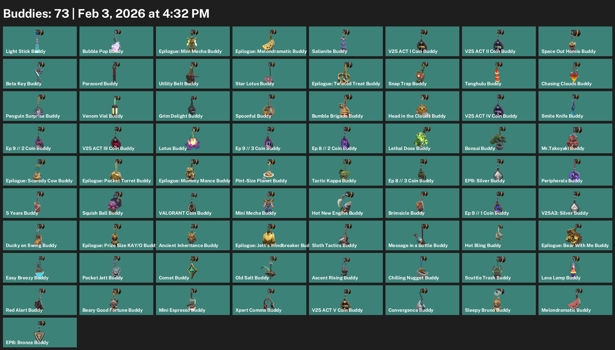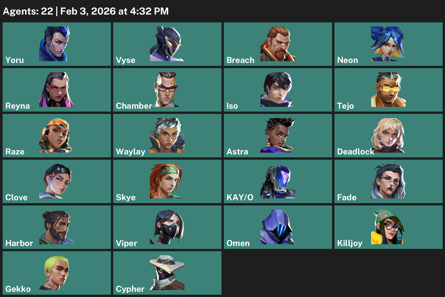Yoru, Vyse, Breach, Neon, Reyna, Chamber, Iso, Tejo, Raze, Waylay, Astra, Deadlock, Clove, Skye, KAY/O, Fade, Harbor, Viper, Omen, Killjoy, Gekko, Cypher