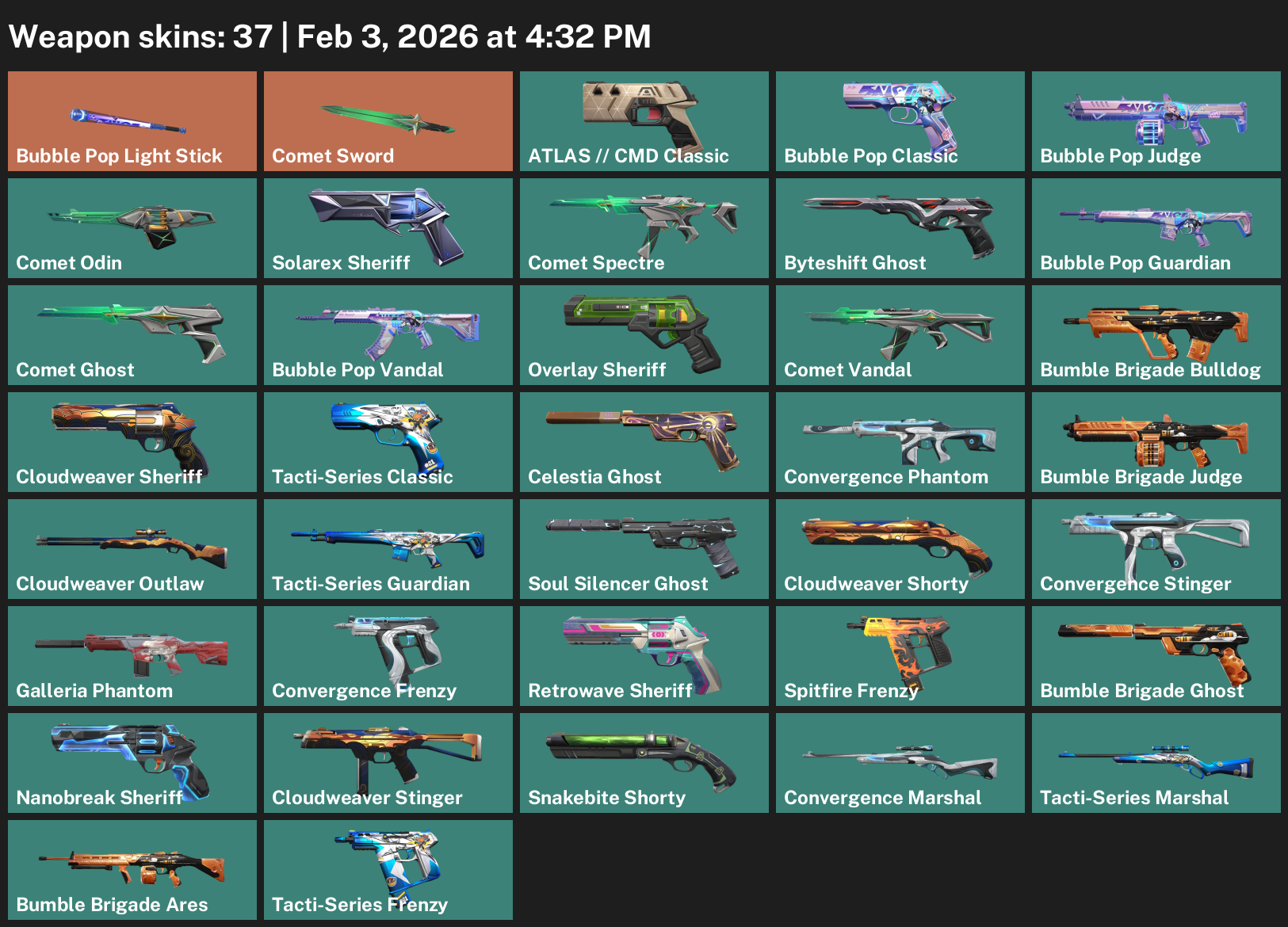 Bubble Pop Light Stick, Comet Sword, ATLAS // CMD Classic, Solarex Sheriff, Byteshift Ghost, Bumble Brigade Bulldog, Convergence Phantom, Cloudweaver Outlaw, Tacti-Series Guardian