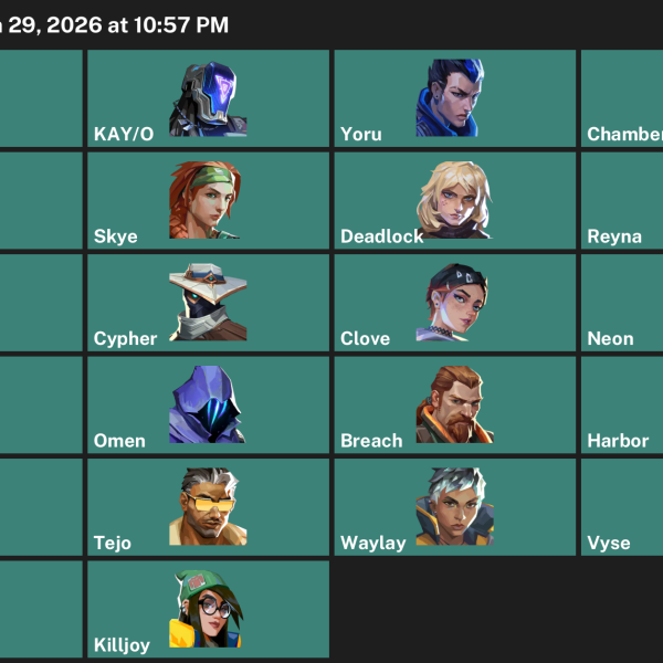 Chamber, Iso, KAY/O, Breach, Cypher, Reyna, Neon, Deadlock, Viper, Fade, Harbor, Killjoy, Yoru, Omen, Clove, Gekko, Astra, Raze, Skye, Vyse