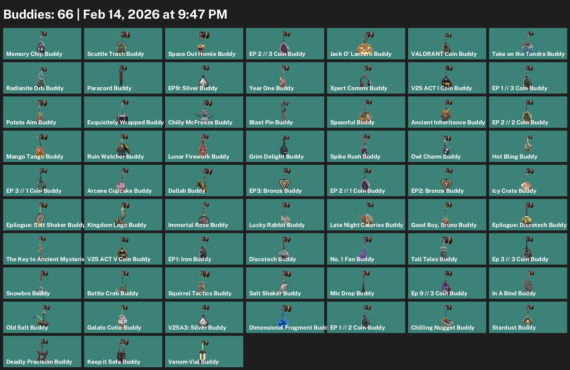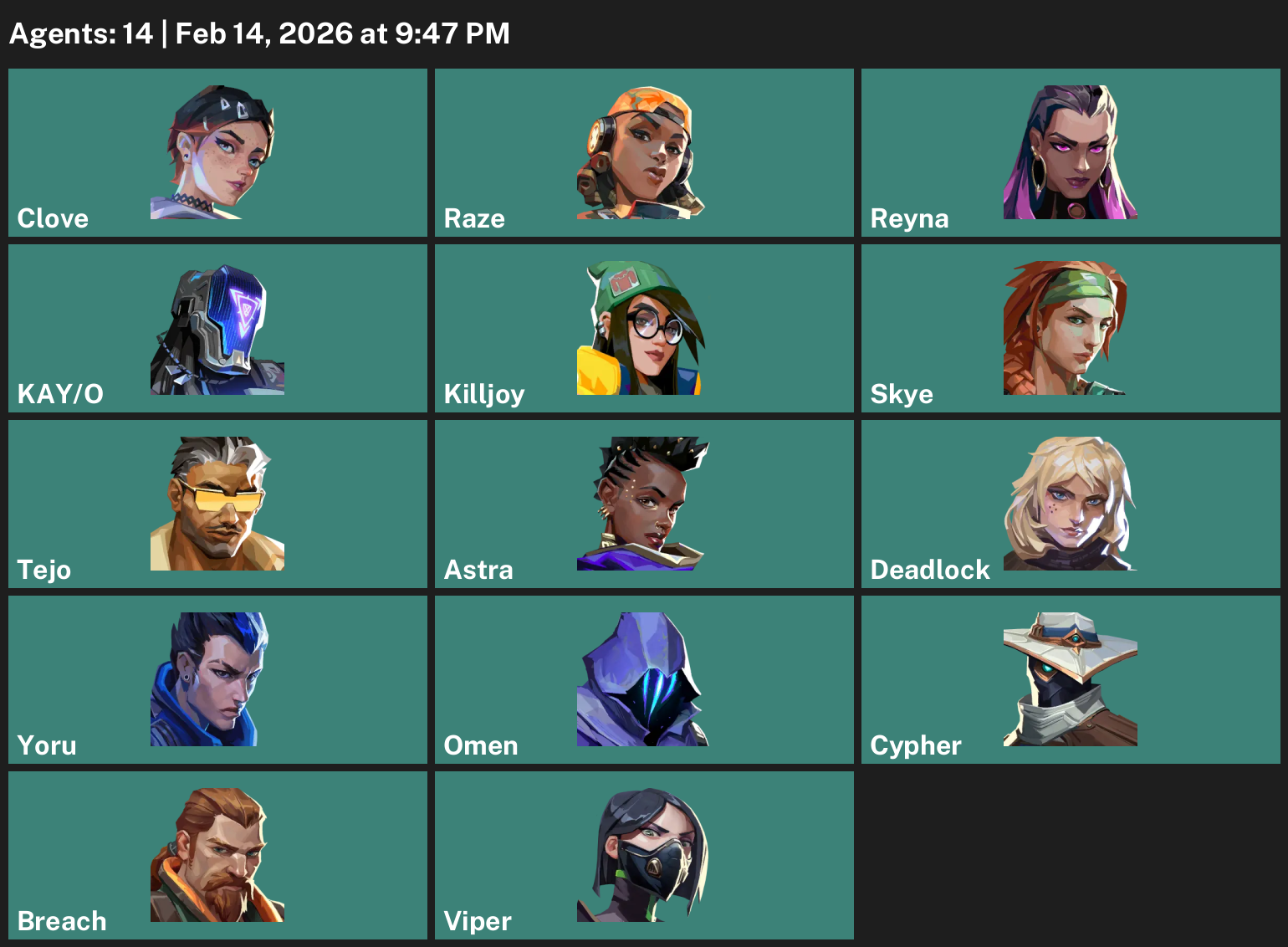 Clove, Raze, Reyna, KAY/O, Killjoy, Skye, Tejo, Astra, Deadlock, Yoru, Omen, Cypher, Breach, Viper