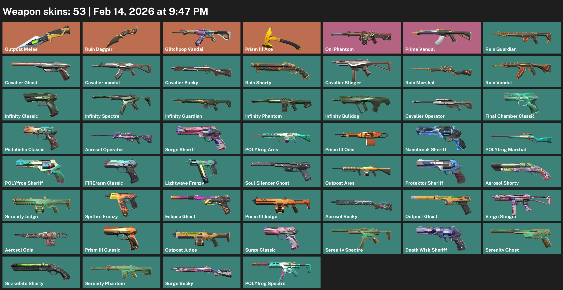 Outpost Melee, Ruin Dagger, Glitchpop Vandal, Prism III Axe, Oni Phantom, Cavalier Ghost, Infinity Classic, Aerosol Operator, Surge Sheriff, POLYfrog Ares