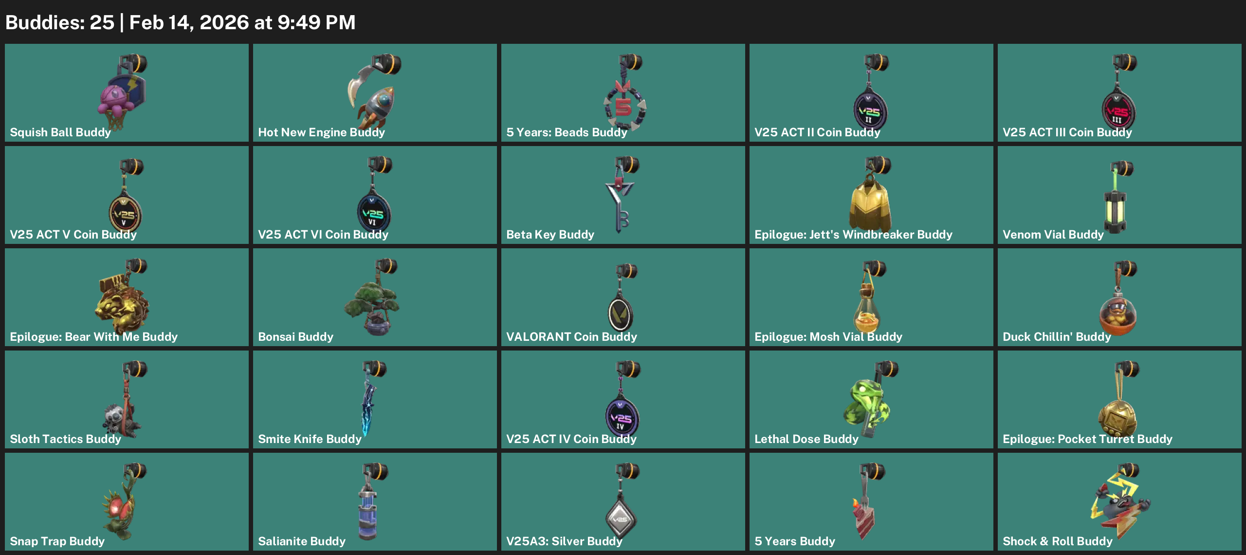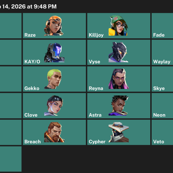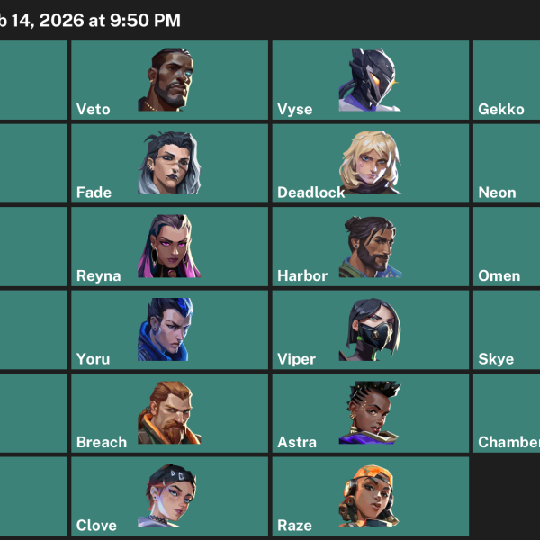 Iso, Vyse, Gekko, Waylay, Fade, Deadlock, Neon, Tejo, Reyna, Harbor, Omen, Cypher, Yoru, Viper, Skye, KAY/O, Breach, Astra, Chamber, Killjoy, Clove, Raze