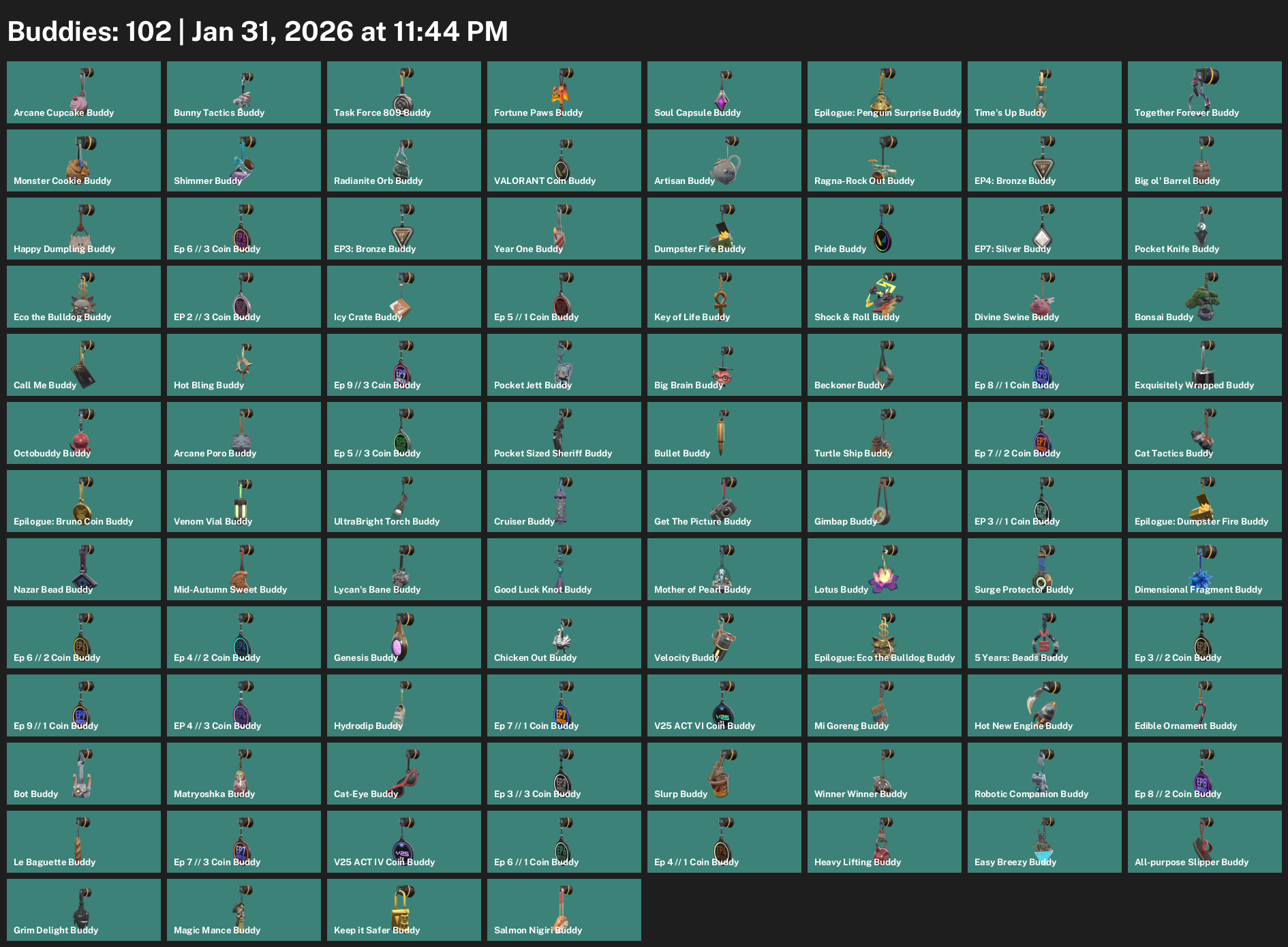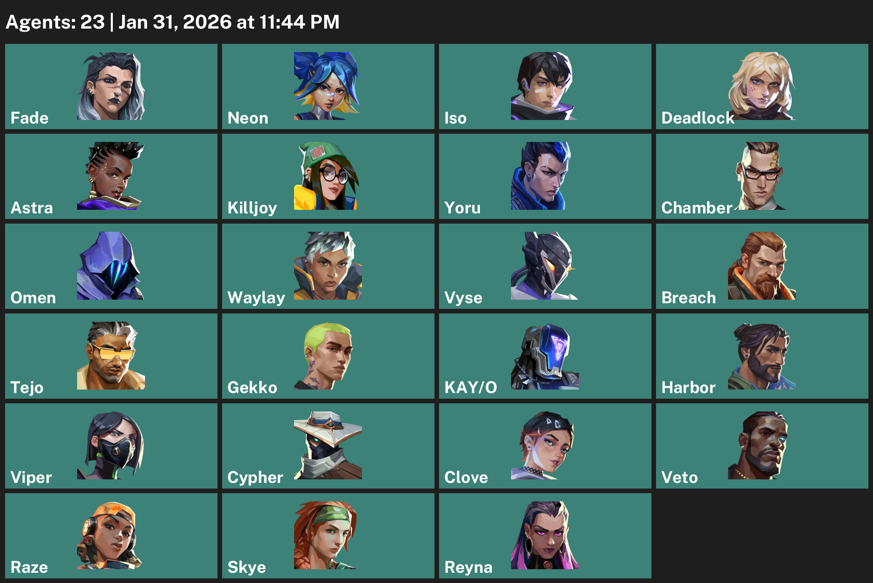 Fade, Neon, Iso, Deadlock, Astra, Killjoy, Yoru, Chamber, Omen, Waylay, Vyse, Breach, Tejo, Gekko, KAY/O, Harbor, Viper, Cypher, Clove, Raze, Skye, Reyna