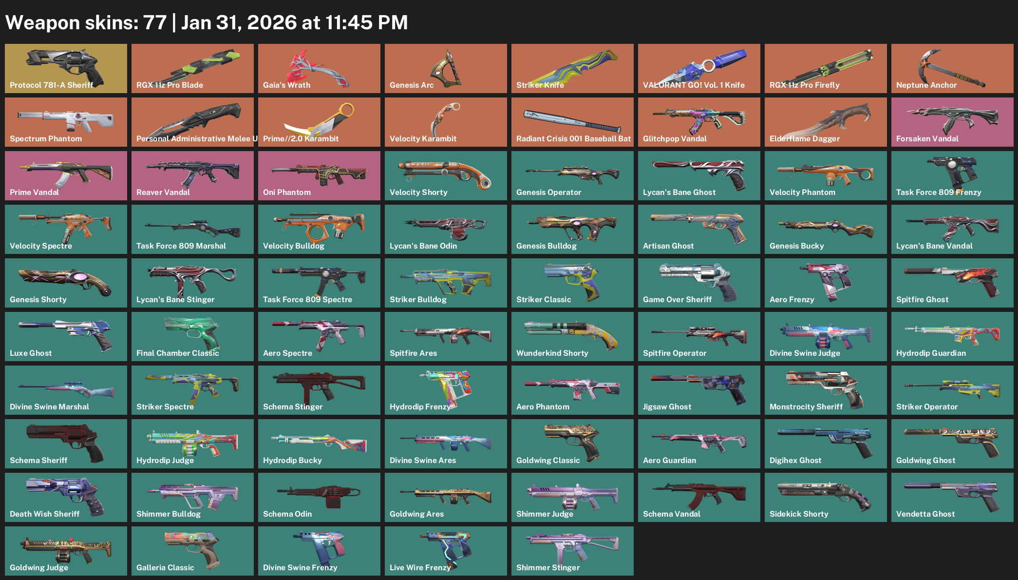 Protocol 781-A Sheriff, RGX 11z Pro Blade, Gaia’s Wrath, Genesis Arc, Striker Knife, Neptune Anchor, Spectrum Phantom, Personal Administrative Melee Unit, Prime//2.0 Karambit, Radiant Crisis 001 Baseball Bat, Glitchpop Vandal, Elderflame Dagger, Velocity Shorty, Lycan’s Bane Ghost, Task Force 809 Frenzy