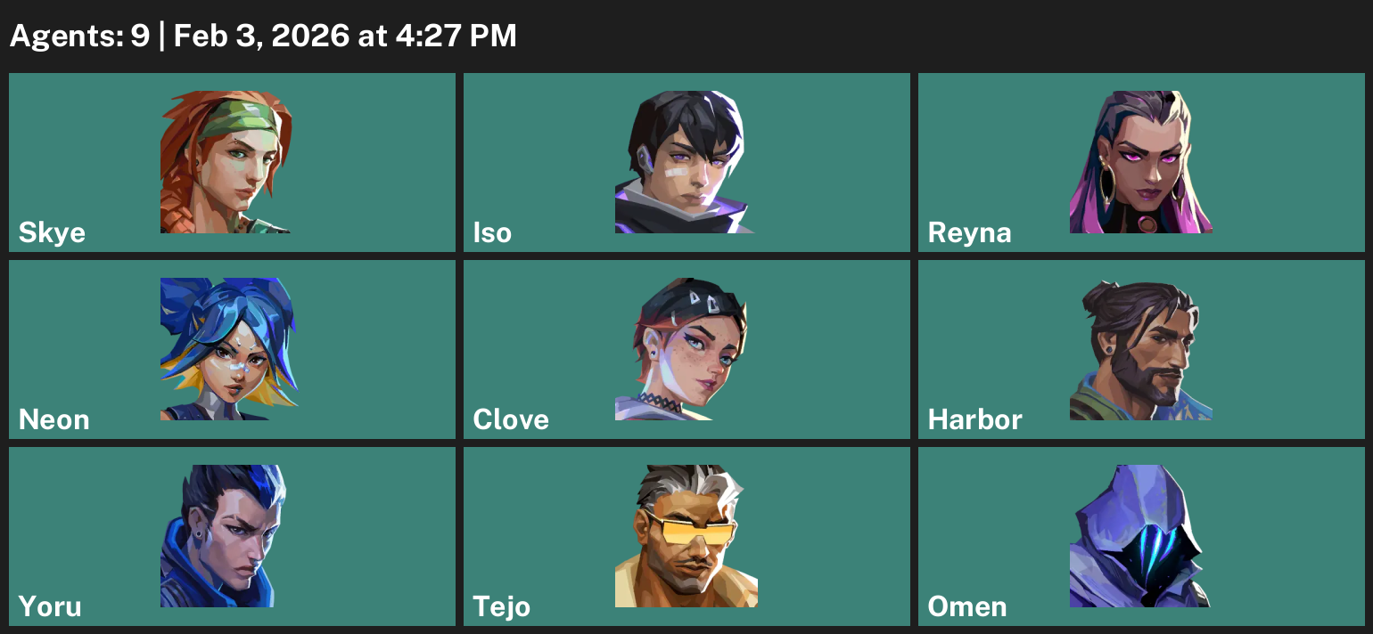 Skye, Iso, Reyna, Neon, Clove, Harbor, Yoru, Tejo, Omen