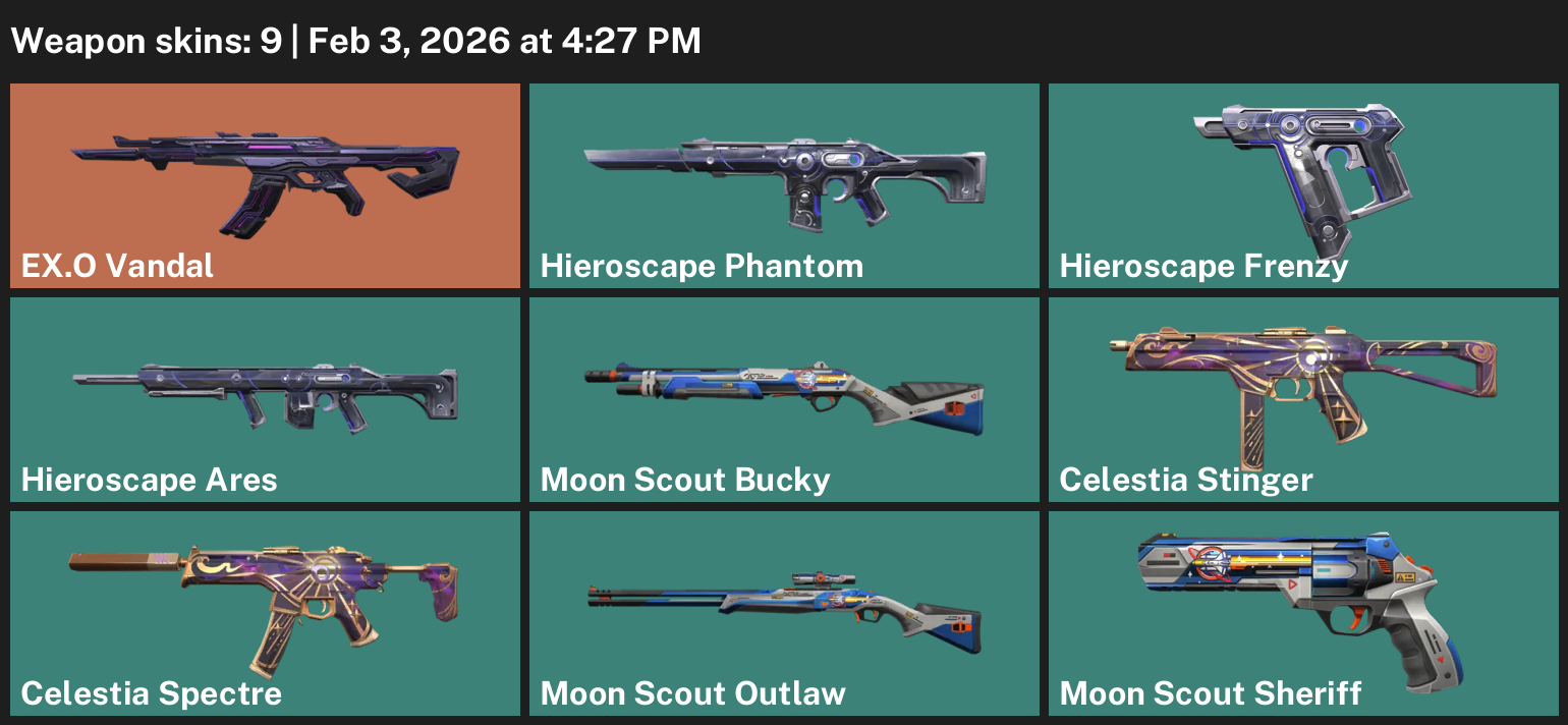 EX.O Vandal, Hieroscape Phantom, Moon Scout Bucky, Celestia Stinger