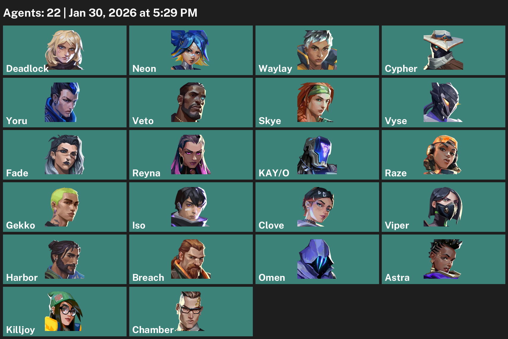 Deadlock, Neon, Waylay, Cypher, Yoru, Skye, Vyse, Fade, Reyna, KAY/O, Raze, Gekko, Iso, Clove, Viper, Harbor, Breach, Omen, Astra, Killjoy, Chamber