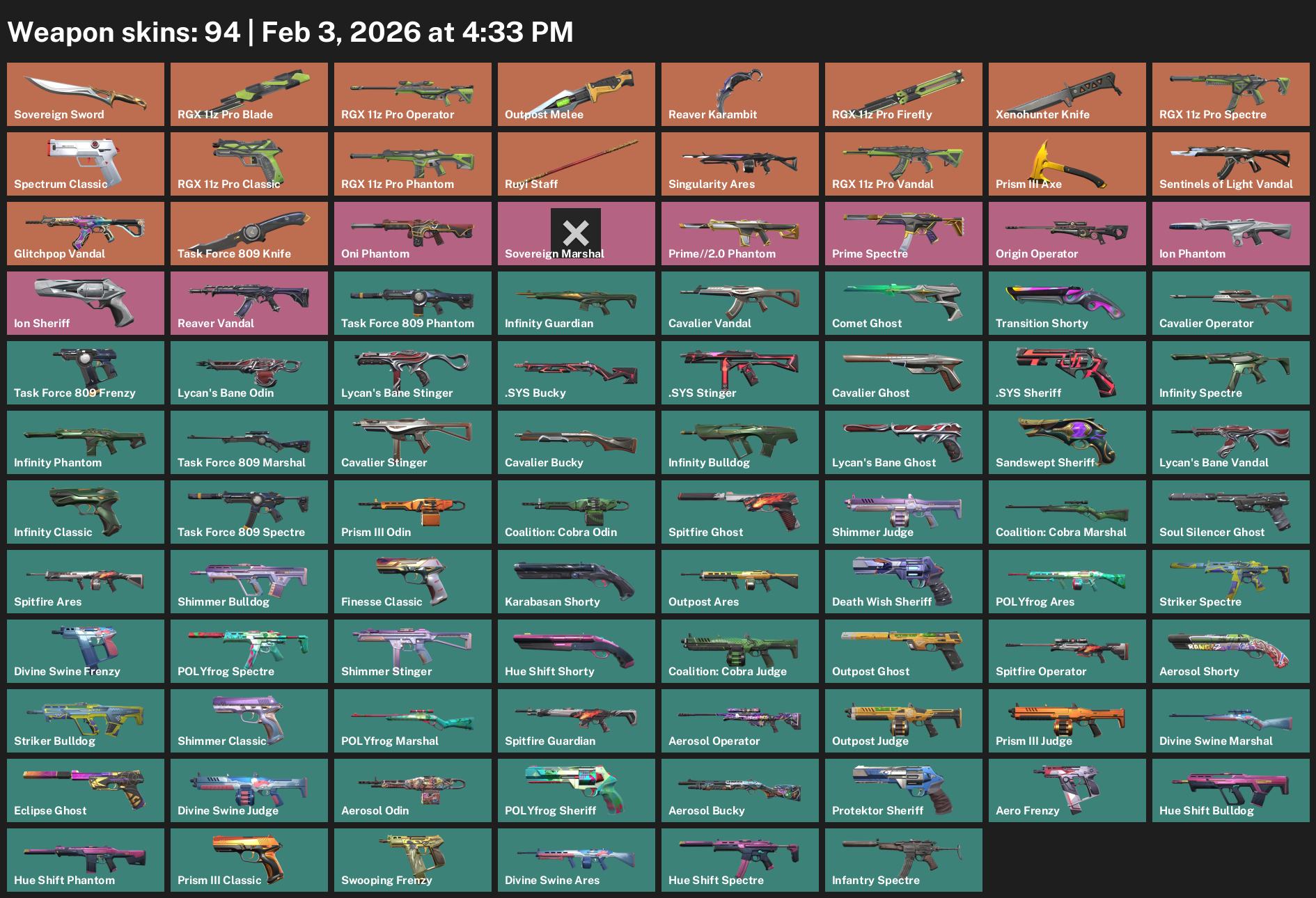 Sovereign Sword, RGX 11z Pro Blade, Outpost Melee, Reaver Karambit, Xenohunter Knife, Spectrum Classic, Ruyi Staff, Singularity Ares, Prism III Axe, Sentinels of Light Vandal, Oni Phantom, Prime Spectre, Origin Operator, Ion Sheriff