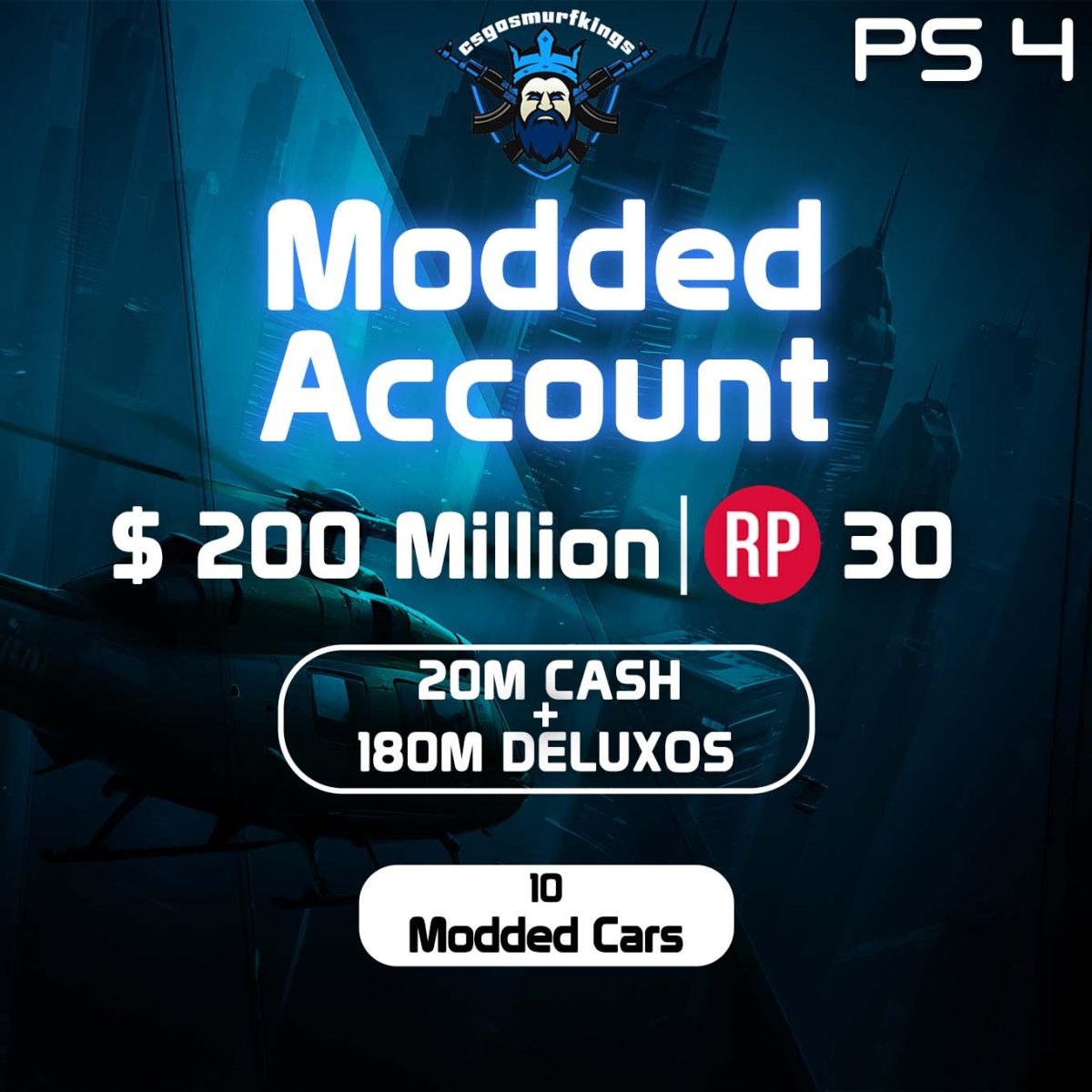 Check out PS4 Modded Account with | 10 Modded Cars | 200M (20M Pure Cash + 480M Deluxos) | RP Level 30