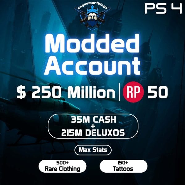 Check out PS4 Modded Account with Male Character Max Stats & 150+ Rare Tattoos | 91 Modded Outfits + 250M (35M Pure Cash + 225M Deluxos) | RP Level 50 | 500+ Rare Clothing $140.00 $28.99