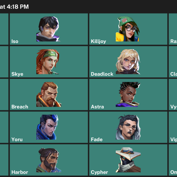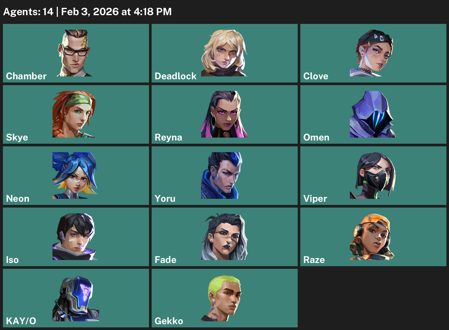Chamber, Deadlock, Clove, Skye, Reyna, Omen, Neon, Yoru, Viper, Iso, Fade, Raze, KAY/O, Gekko