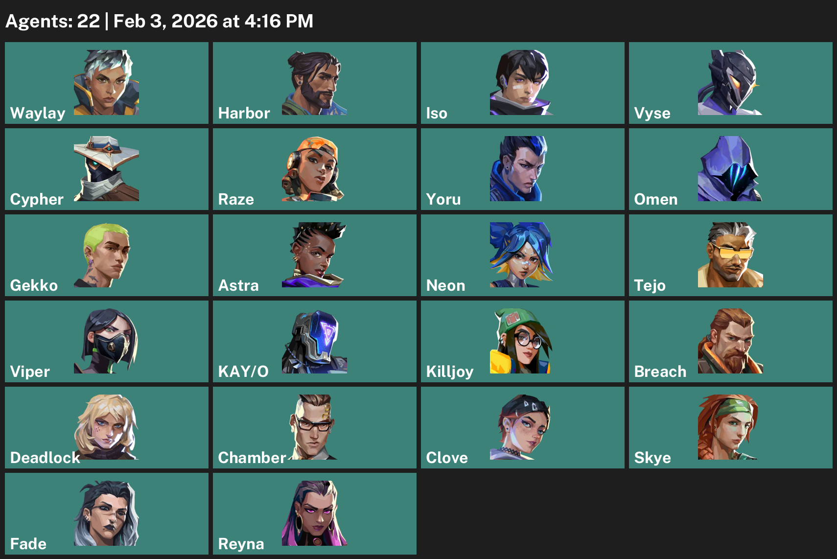 Waylay, Harbor, Iso, Vyse, Cypher, Raze, Yoru, Omen, Gekko, Astra, Neon, Tejo, Viper, KAY/O, Killjoy, Breach, Deadlock, Chamber, Clove, Skye, Fade, Reyna